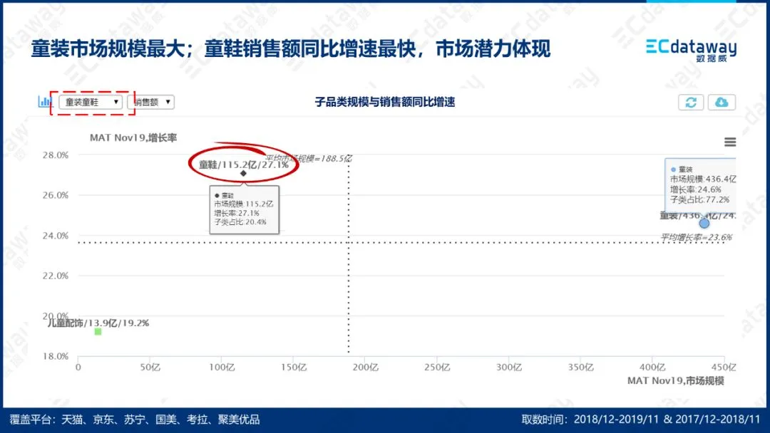 如上图所示,童装童鞋线上市场中,童装品类规模最大,线上销售额达到436.4亿元;而童鞋销售额同比增速最快,达27.1%,市场潜力大,是该行业重点研究子品类。