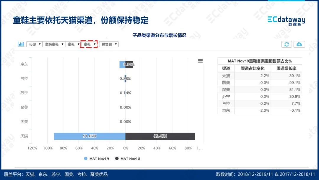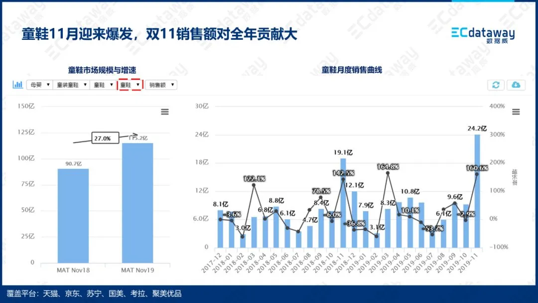 从童鞋月度线上消费曲线数据来看,2019年11月销售额达24.2亿元,环比10月增长160.6亿元,迎来爆发,而6月则无明显销售增长。可见,双11对童鞋品类全年线上销售额贡献最大;从电商大促角度出发,双11的优先级与资源侧重也应高于618。