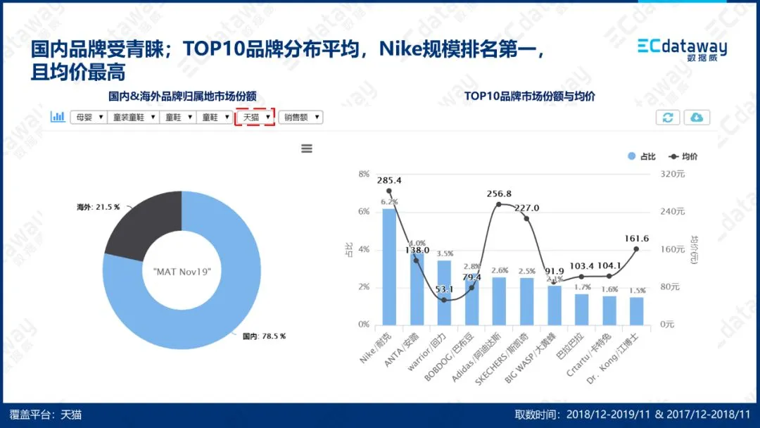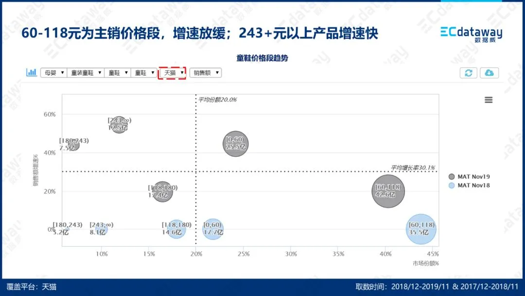 如上图所示,童鞋在天猫平台的市场份额达91.6%,是主要分销渠道。我们聚焦该品类在天猫上的零售数据,对应市场洞察中的价格段趋势分析模块可知,60-118元价格段产品规模排名第一,达42.6亿元,但增速有所放缓。243元以上的价位段产品销售额同比增速最快,高达50%。可见,消费者对线上品质高端化需求明显,对品牌与正品的诉求也越来越成为刚需。