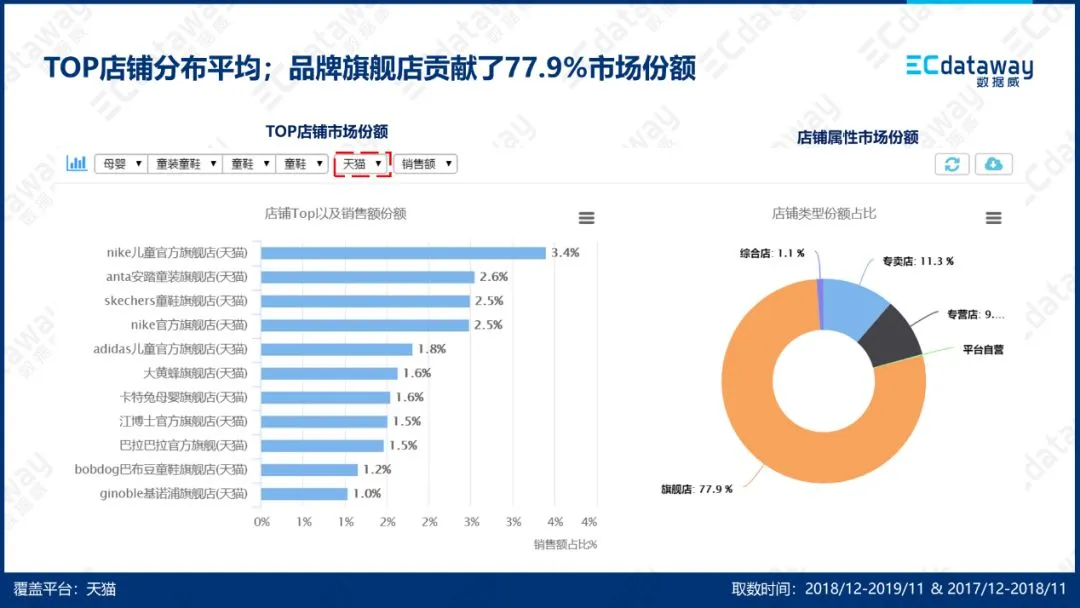 在线上,童鞋品类主要依托品牌旗舰店分销,其市场份额达77.9%,是品牌方入局天猫平台的首要选择。TOP品牌店铺分布平均,Nike儿童官方旗舰店排名第一,占市场份额3.4%;安踏与斯凯奇品牌旗舰店分列二、三位。