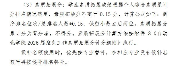 学生素质拓展成绩根据个人综合素质累计分排名情况确定,素质拓展分不高于0.15分