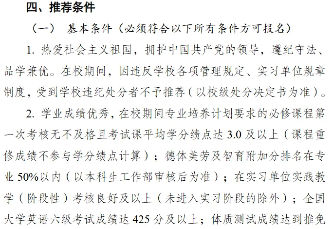 德体美劳及智育附加分排名在专业50%以内(以本科生工作部审核后为准);在实习单位实践教学(阶段性)考核良好及以上(未进入实习阶段的除外)。