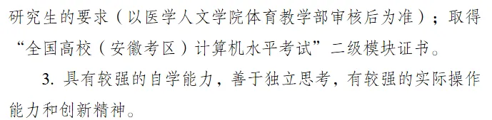 全国大学英语六级考试成绩达425分及以上,体质测试成绩达到推免研究生的要求,取得“全国高校(安徽考区)计算机水平考试”二级模块证书。