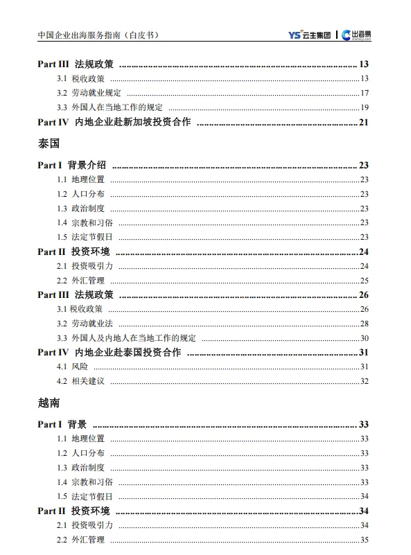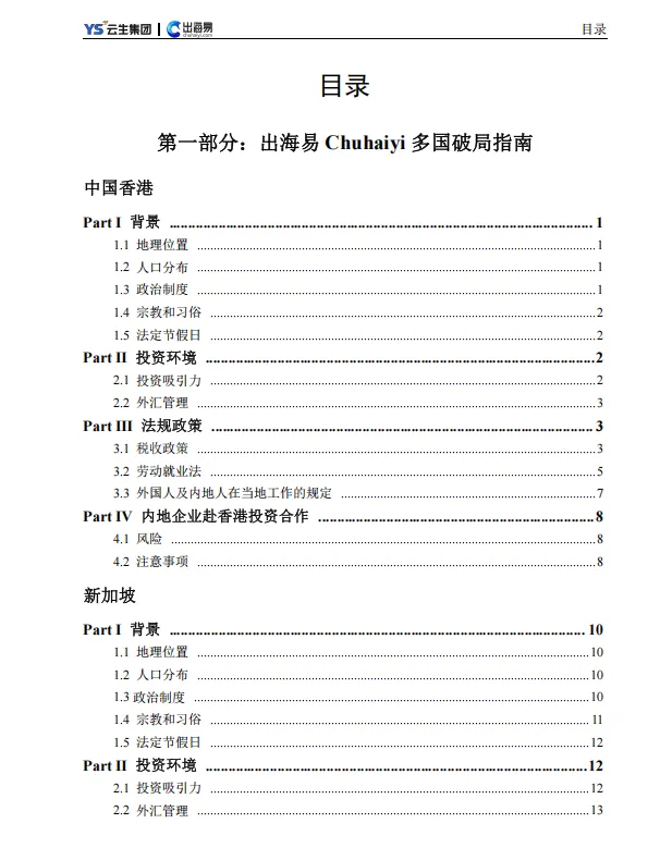 《2024 中国企业出海服务指南白皮书》覆盖东南亚、欧洲、非洲等多国投资环境、税收与用工法规,核心聚焦全球雇、全球薪等合规解决方案。报告提供 158 国一体化服务,拆解出海常见风险与应对策略。