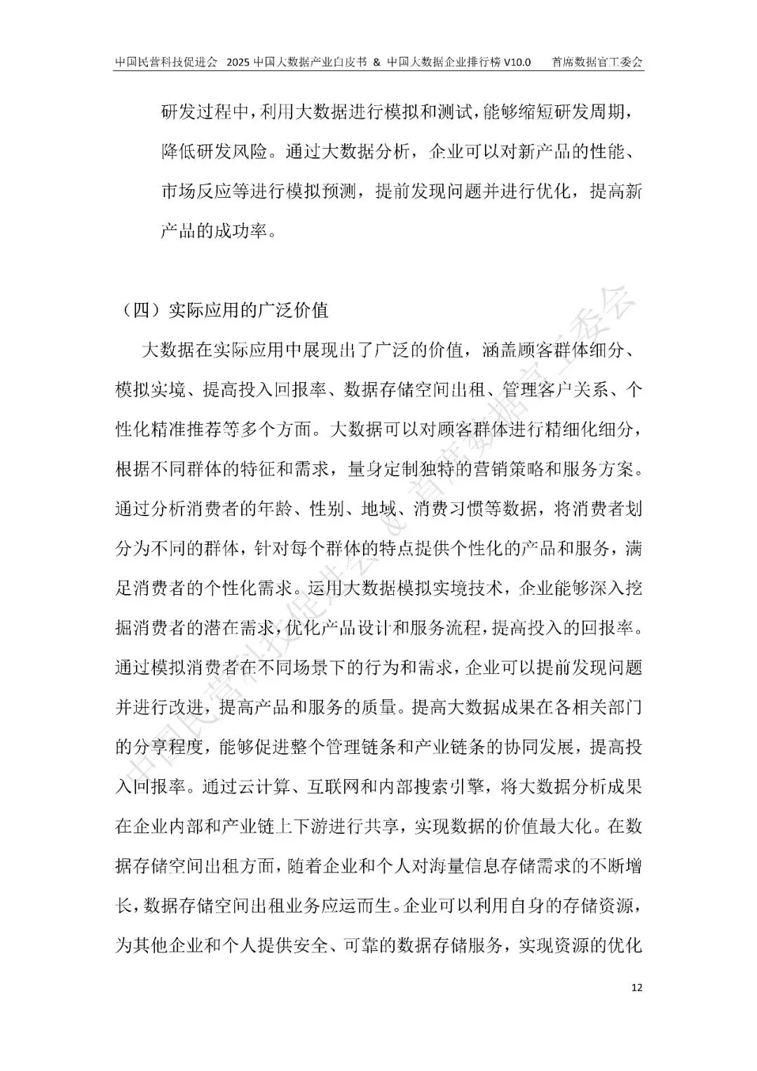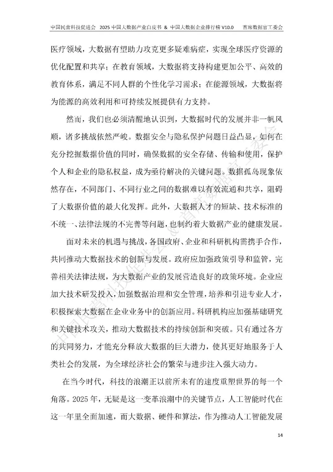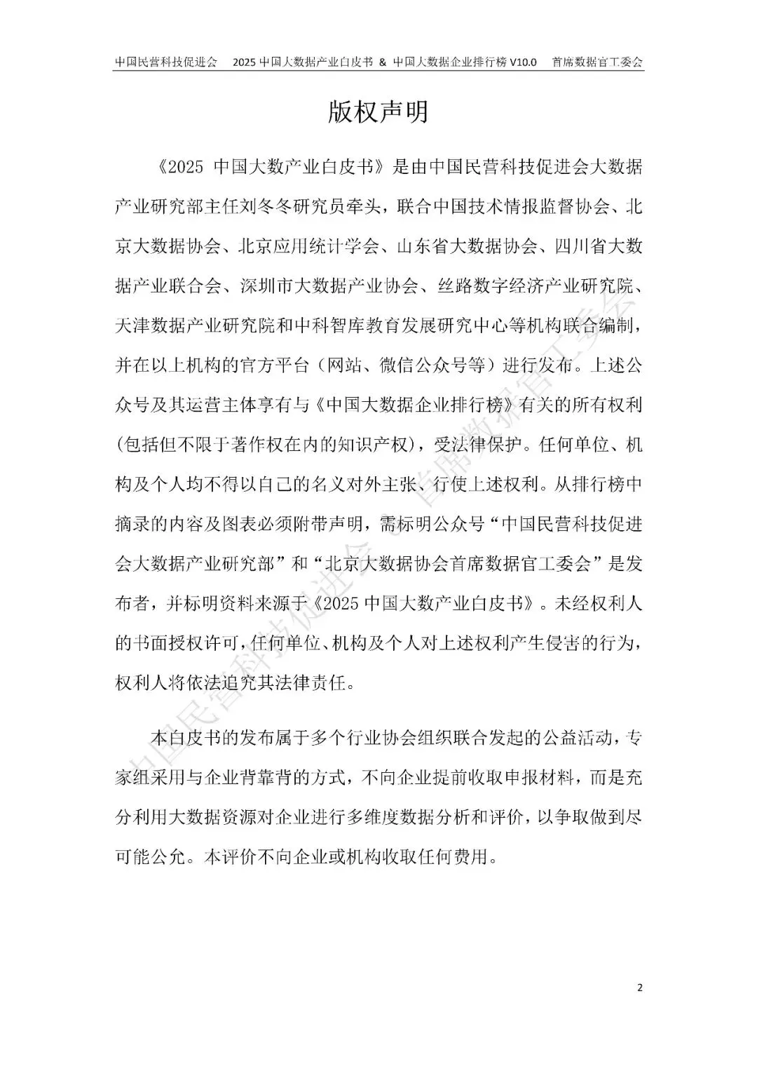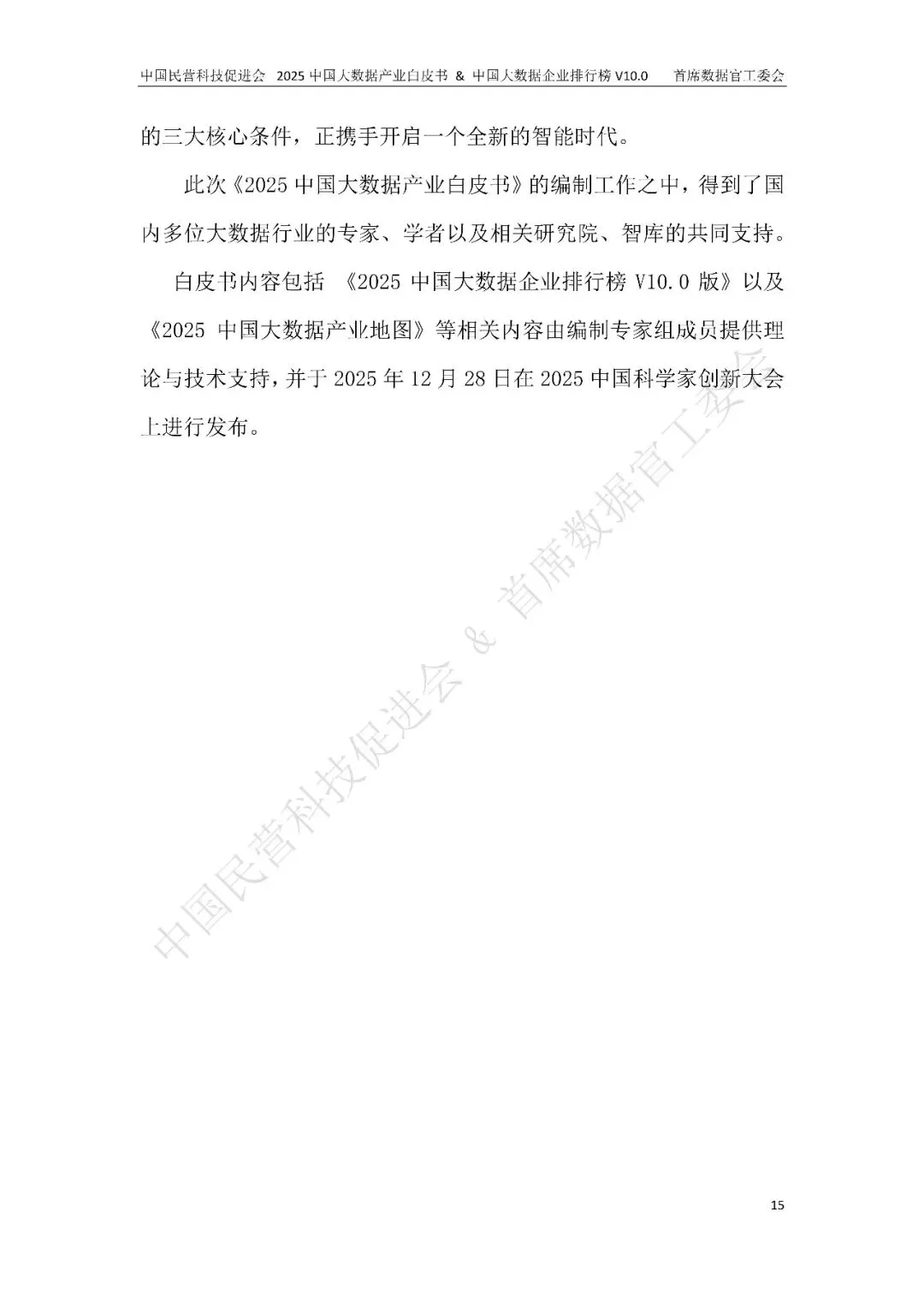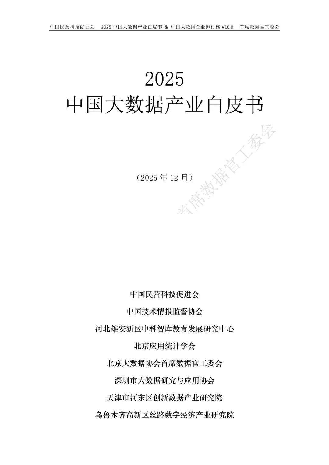 《2025中国大数产业白皮书》是由中国民营科技促进会联合中国技术情报监督协会、北京大数据协会、山东省大数据协会、四川省大数据产业联合会、深圳市大数据产业协会、丝路数字经济产业研究院、天津数据产业研究院和中科智库教育发展研究中心等机构联合编制。