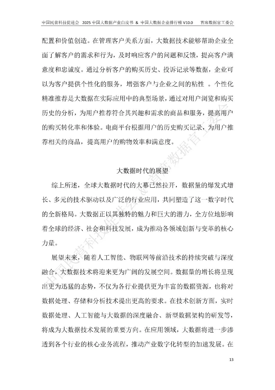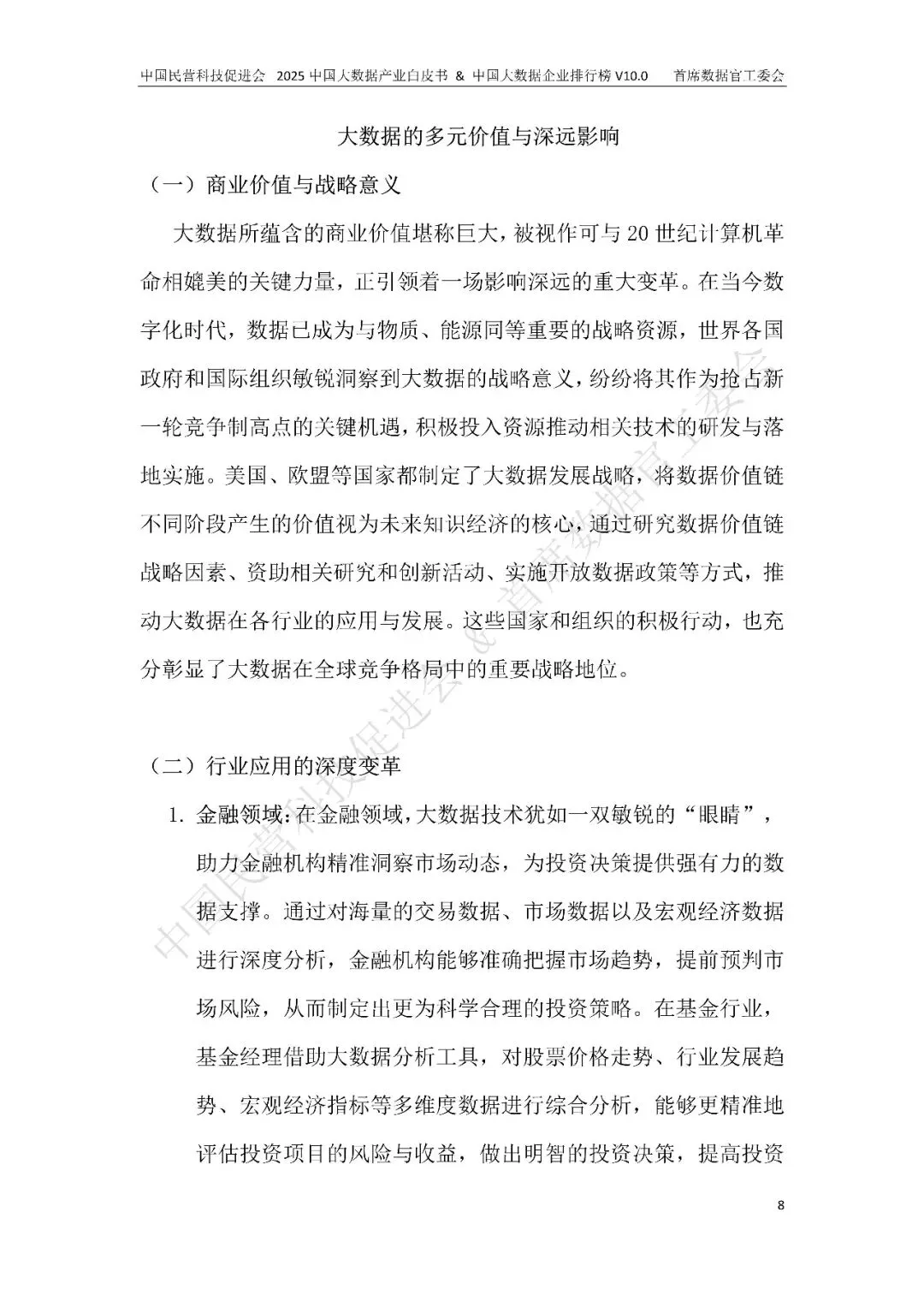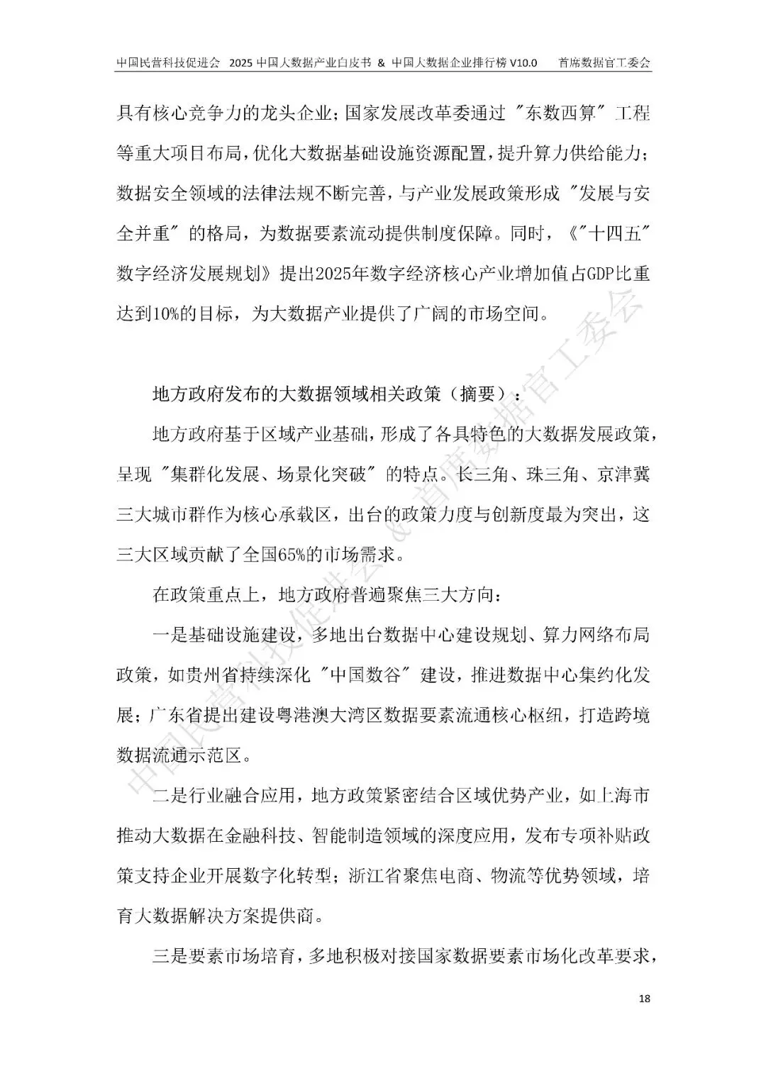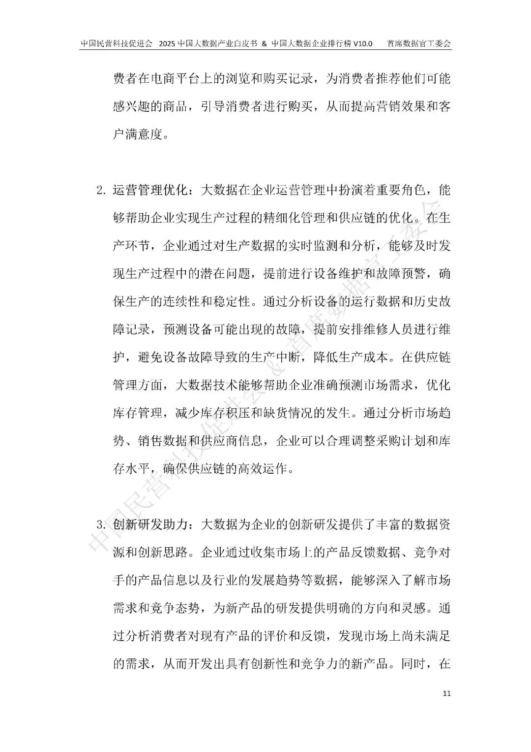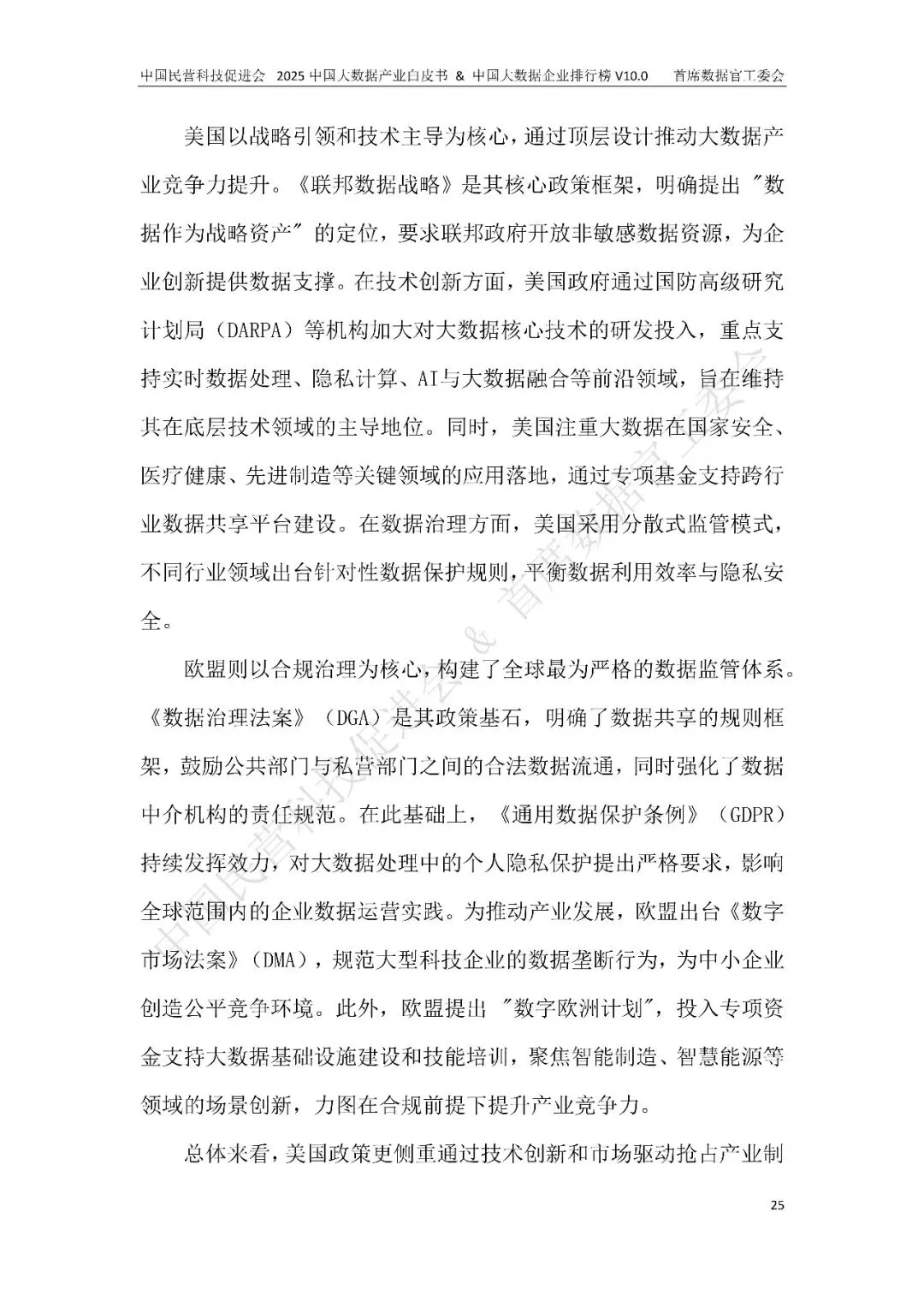 《2025中国大数产业白皮书》是由中国民营科技促进会联合中国技术情报监督协会、北京大数据协会、山东省大数据协会、四川省大数据产业联合会、深圳市大数据产业协会、丝路数字经济产业研究院、天津数据产业研究院和中科智库教育发展研究中心等机构联合编制。