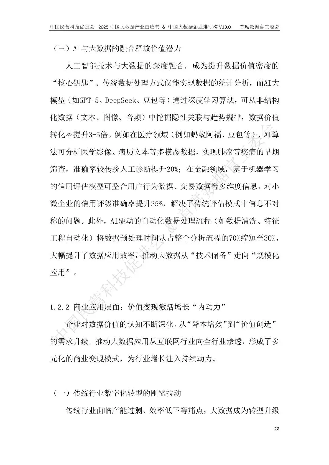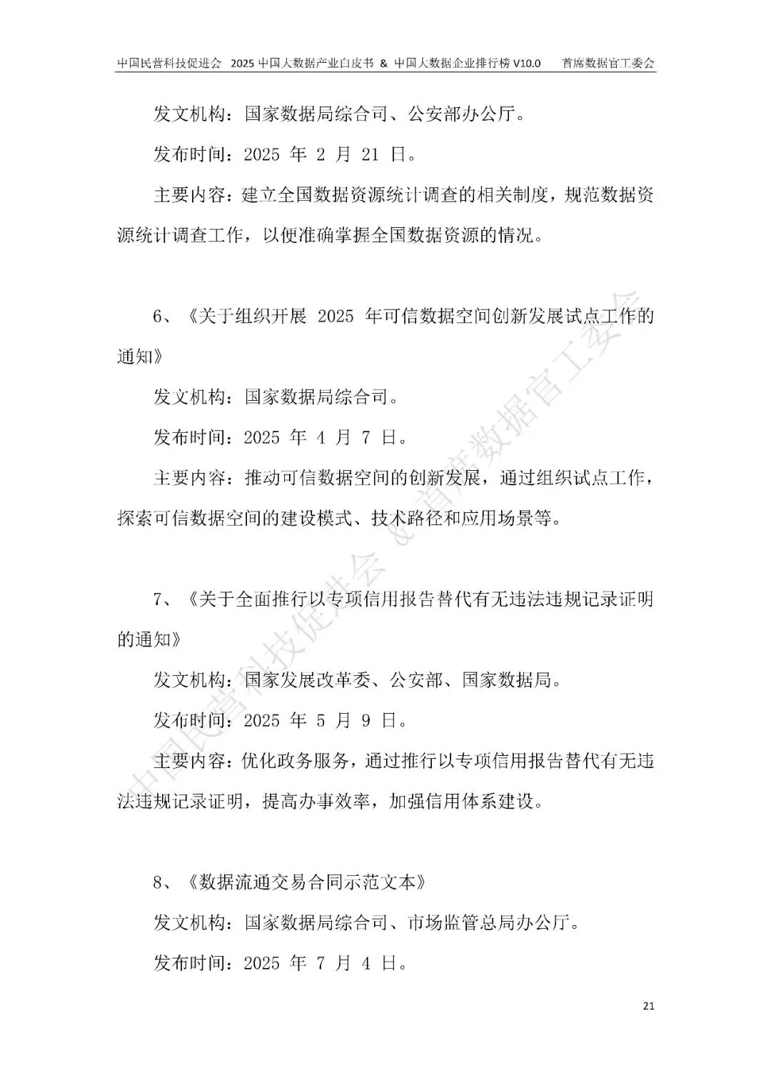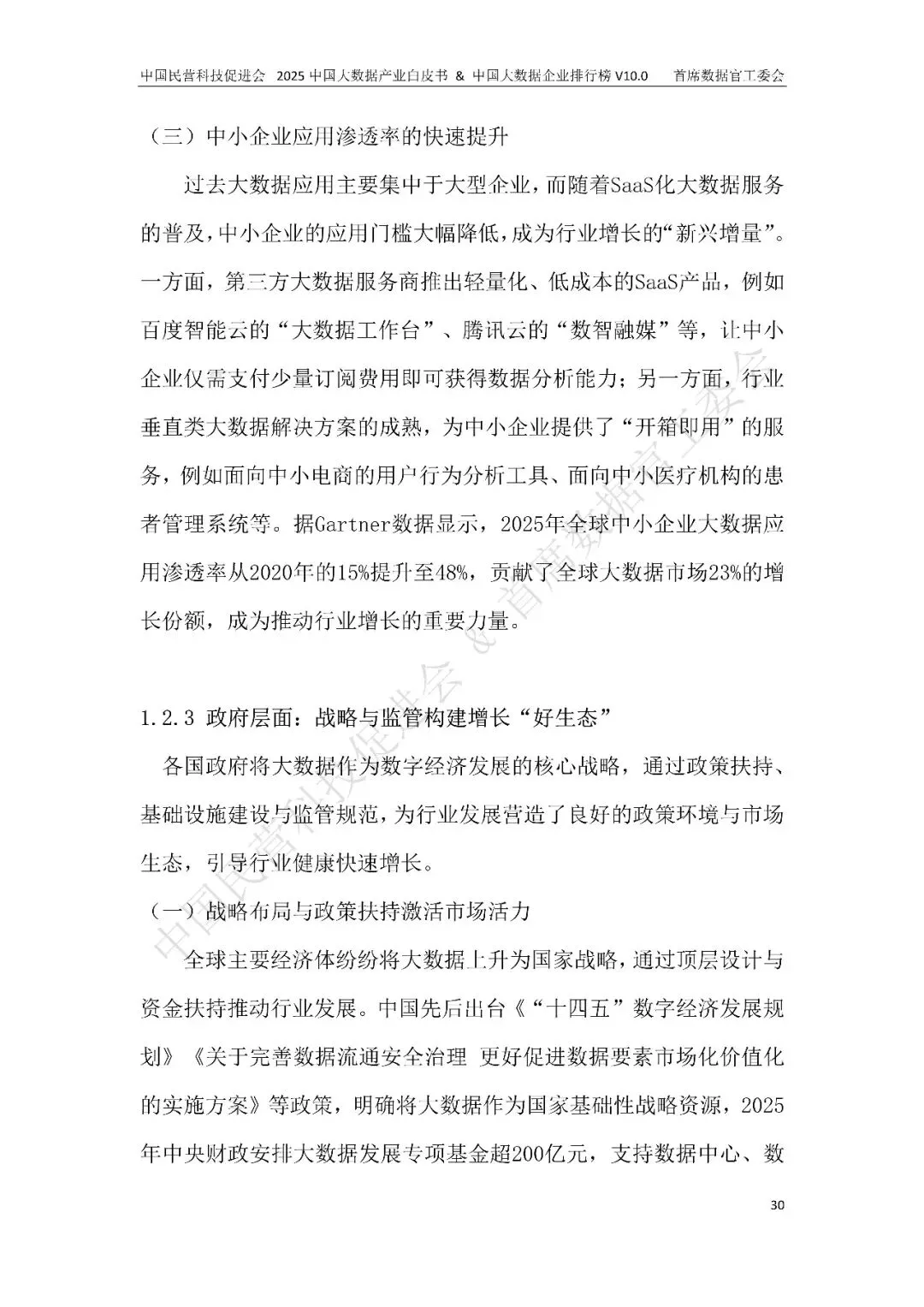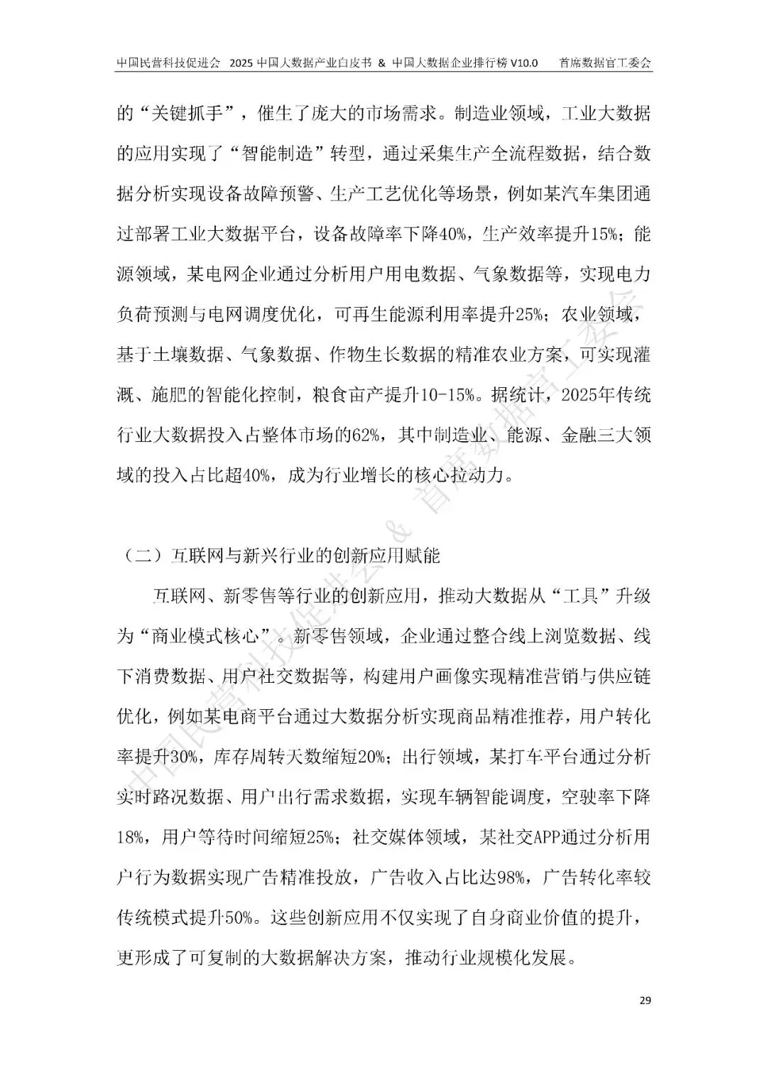 《2025中国大数产业白皮书》是由中国民营科技促进会联合中国技术情报监督协会、北京大数据协会、山东省大数据协会、四川省大数据产业联合会、深圳市大数据产业协会、丝路数字经济产业研究院、天津数据产业研究院和中科智库教育发展研究中心等机构联合编制。