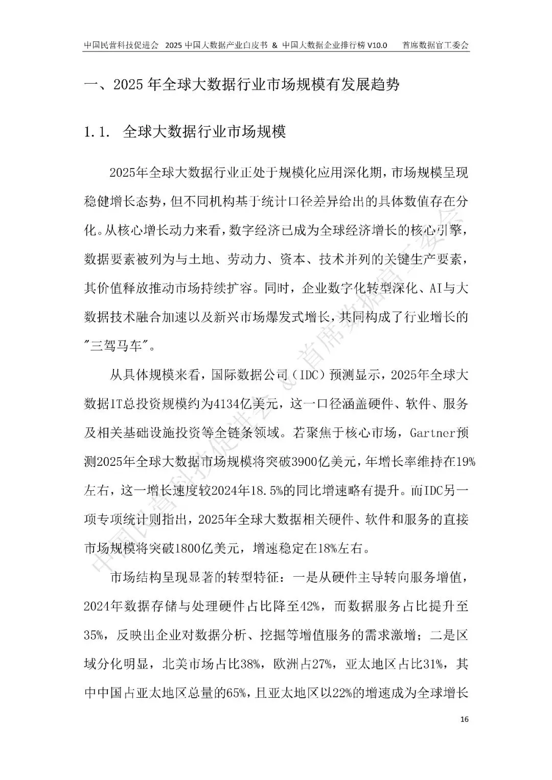市场规模:2025年全球大数据市场规模稳步增长,IDC预测全球大数据IT总投资规模约4134亿美元,Gartner预计市场规模突破3900亿美元,年增长率约19%。