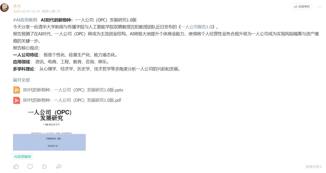 在AI技术以月为单位迭代的今天,一份工作方式的革命正在悄然发生。清华大学沈阳教授团队(@清新研究团队)发布的《一人公司(OPC)发展研究》报告,以137页的篇幅描绘了一幅令人振奋的未来图景:2026年,在AI赋能下,个体商业能力将被极度放大,"一人公司"(One Person Company)正从边缘走向主流,成为数字经济时代的标准创业结构。