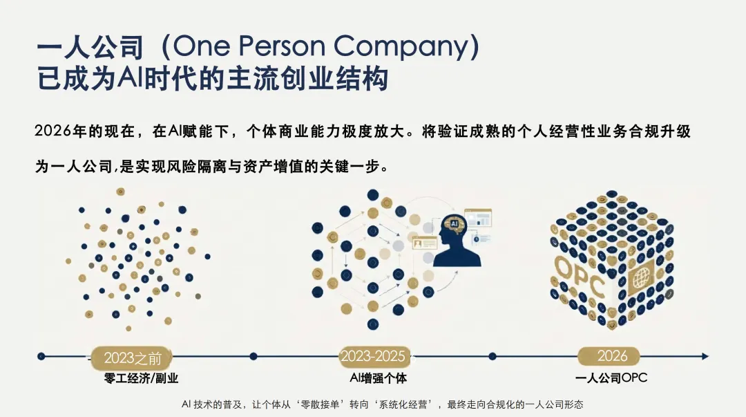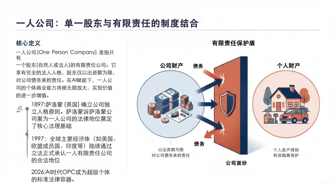 从萨洛蒙案(1897年)确立的公司独立人格原则,到2026年的AI赋能OPC,商业组织的本质正在从"人的集合"转变为"人与算法的共生体"。一人公司不是简单的"个体户升级",而是一种全新的生产关系——人类负责价值观与创造性决策,机器负责海量执行与效率优化。