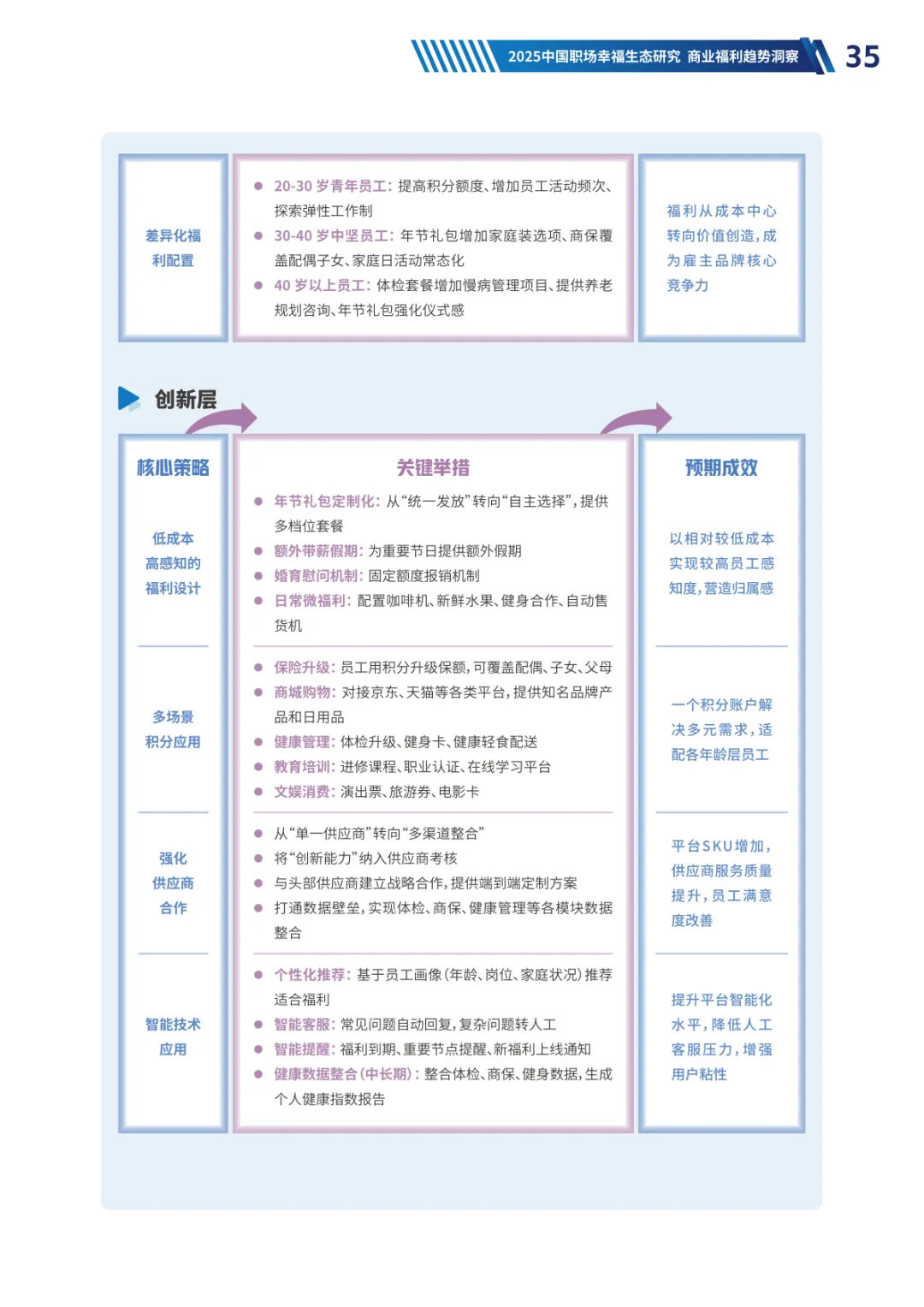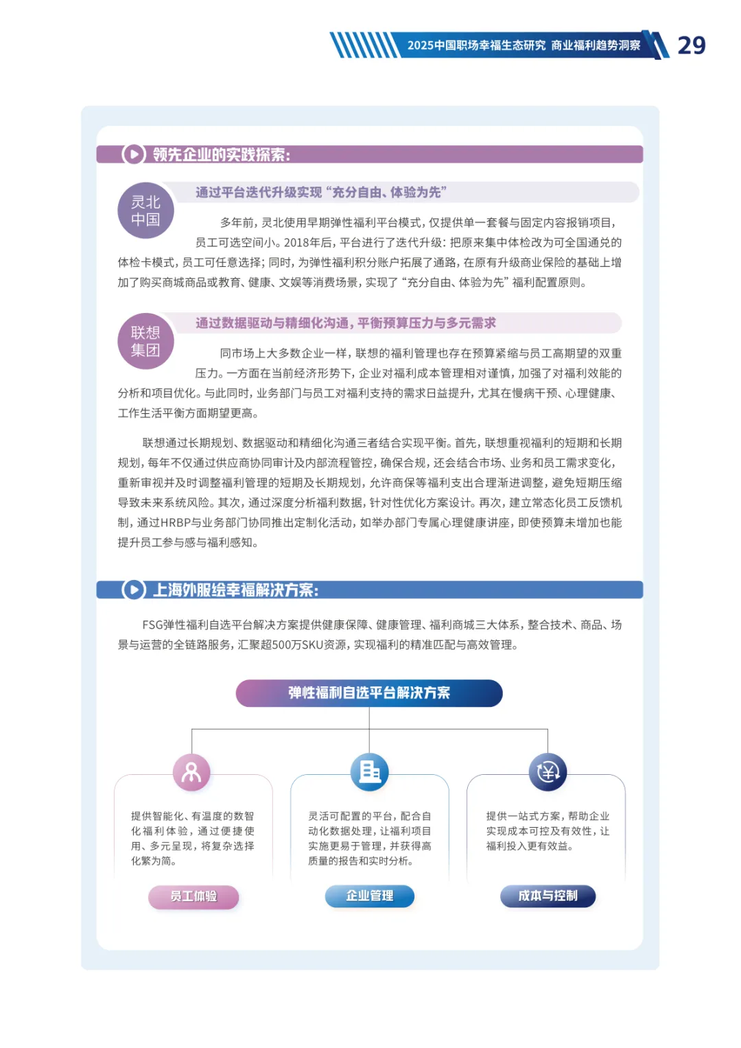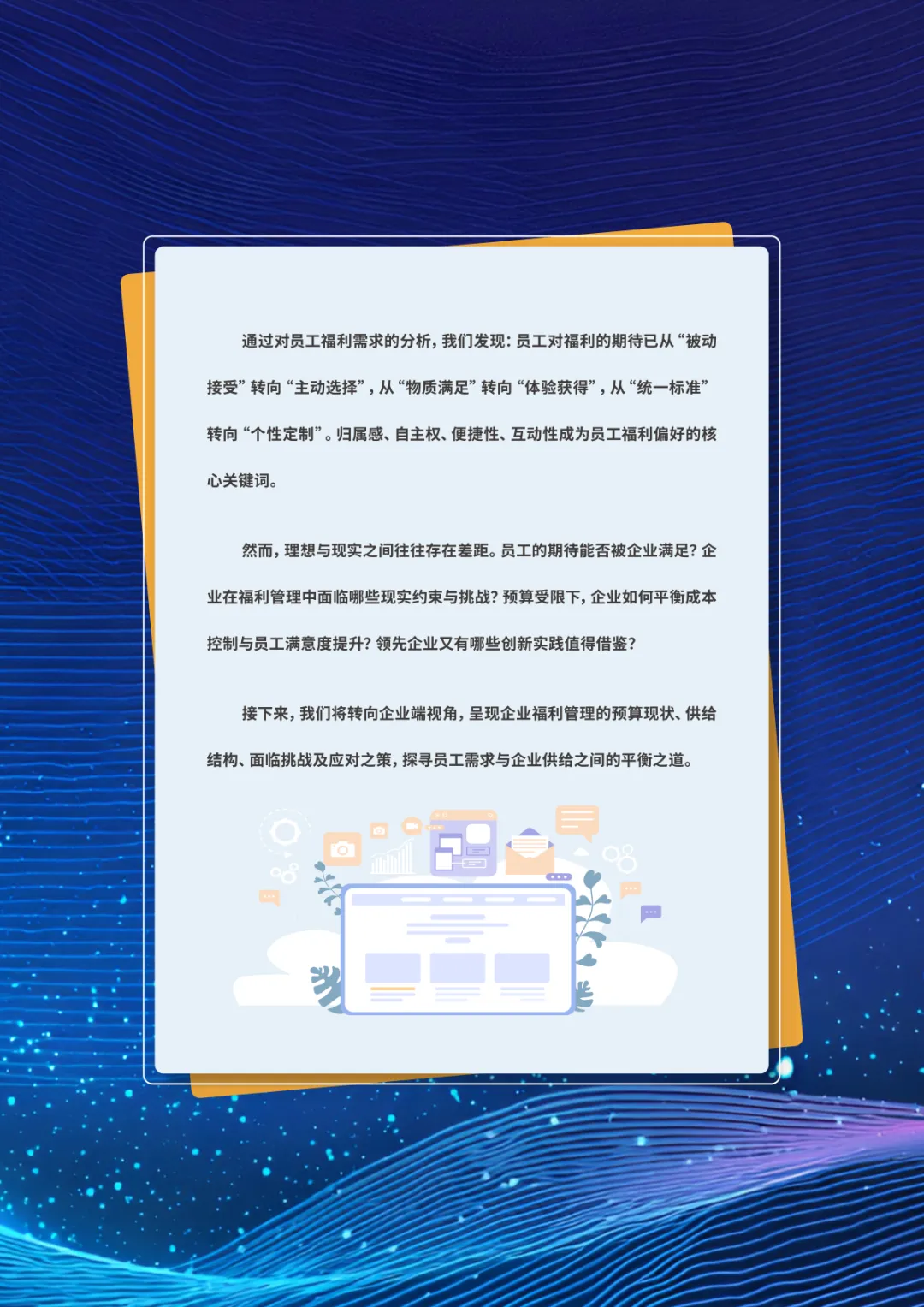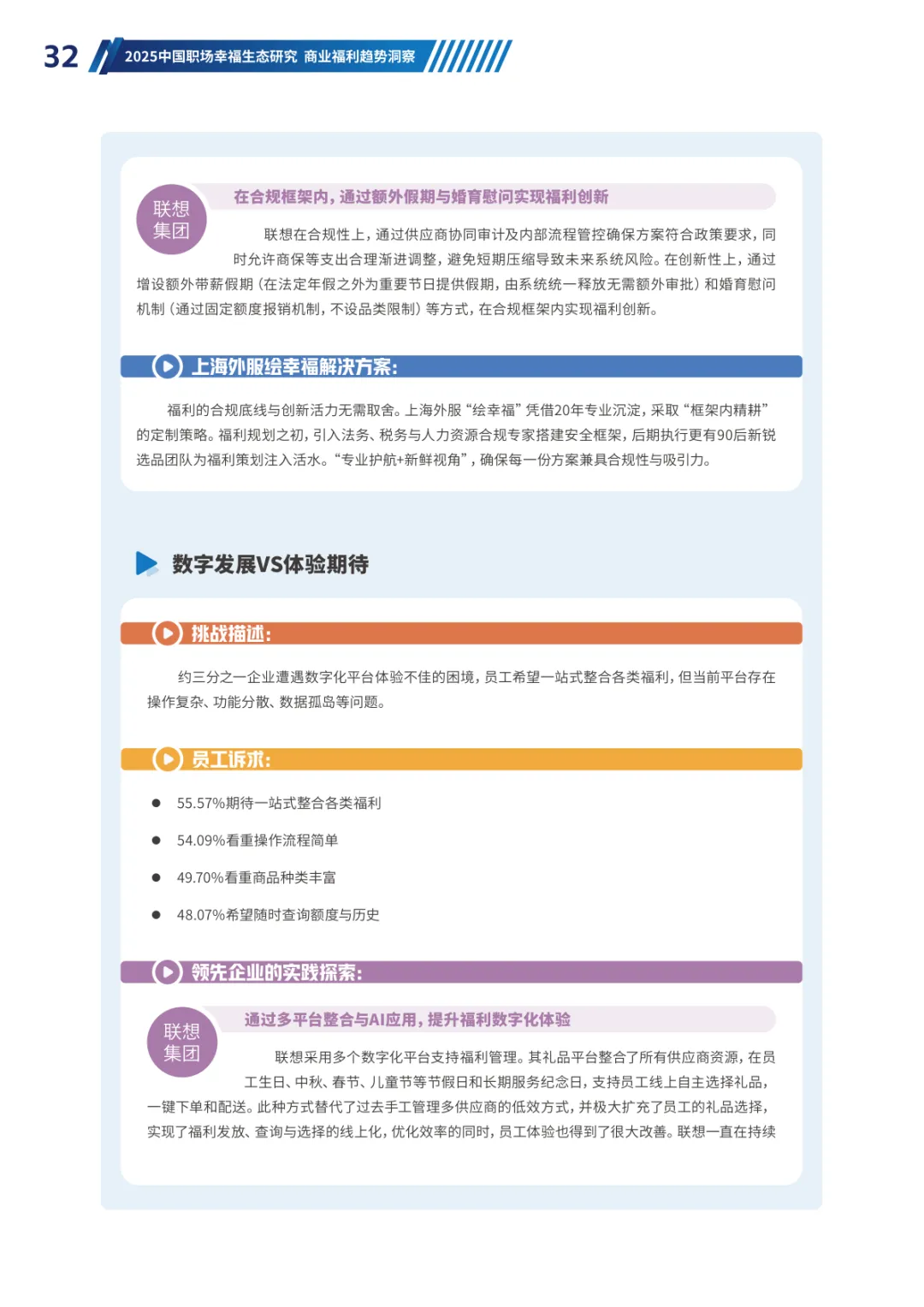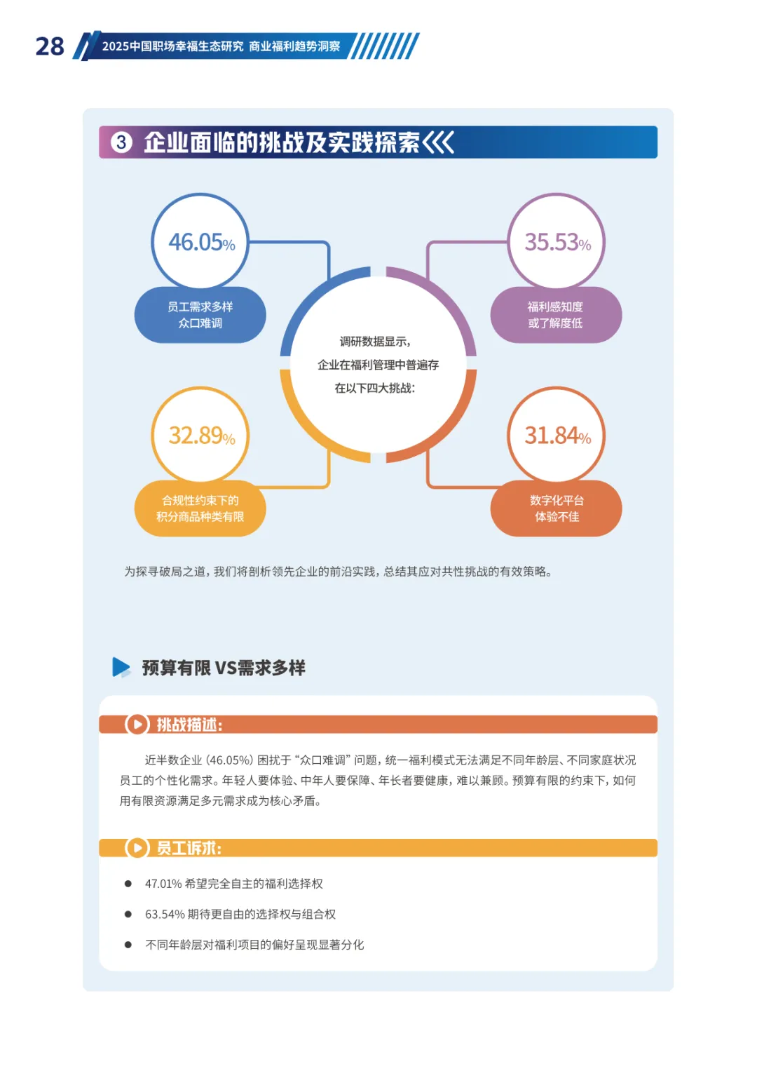 导读:经济承压、Z 世代崛起与价值观转变三大趋势,重塑当下职场生态。员工幸福度连续两年下滑,焦虑从物质层面转向对未来的信心缺失,体验感知类维度降幅显著。不同年龄、行业、企业性质的员工幸福度呈现差异,30-40 岁群体因处于职业价值回报期幸福感最高,金融保险行业凭借高投入保持领先。员工福利需求已从物质保障转向情感归属与个性化体验,归属感和自主选择权成为核心诉求。不同年龄层偏好分化明显,青年员工重视工作生活平衡,30 岁以上群体聚焦生活保障、健康管理与储蓄规划。数字化福利平台需满足集成化、人性化、敏捷响应三大核心期待,破解当前供需错配、感知度低等问题。企业福利预算趋紧,需构建 “固定 + 弹性” 模式,通过一体化数字平台、差异化配置与低成本高感知设计优化体验。从标准化供给转向个性化适配,从物质保障转向情感联结,从分散发放转向一体化体验,成为企业福利管理破局的关键方向,助力提升员工满意度与组织凝聚力。