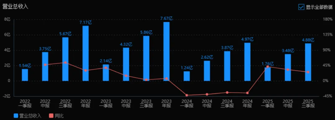 1)营业总收入:2025年三季度的营业总收入为4.88亿元,相较于2024年三季度的3.87亿元增长了25.96%。评价:收入规模持续提升,增速保持在较高水平,显示出公司业务恢复强劲,经营态势向好。