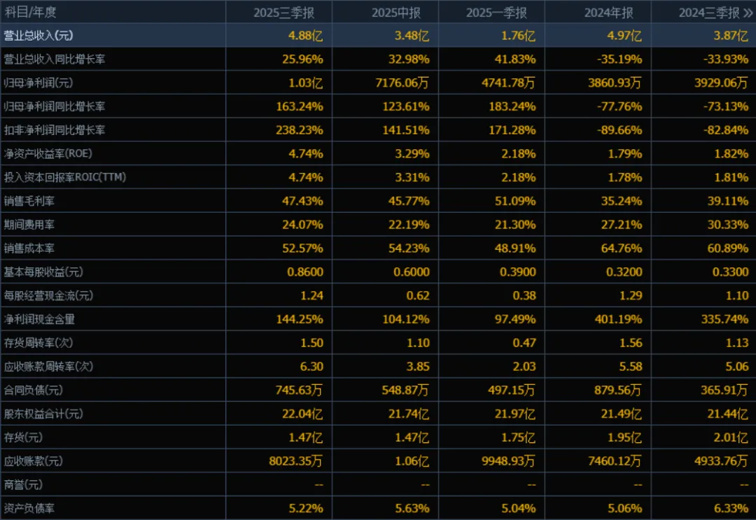 2)归母净利润:2025年三季度的归母净利润为1.03亿元,相较于2024年三季度的3929.06万元增长了163.24%。评价:净利润增速远高于收入增速,说明公司在控制成本或提升盈利能力方面成效显著,经营效率大幅提升。