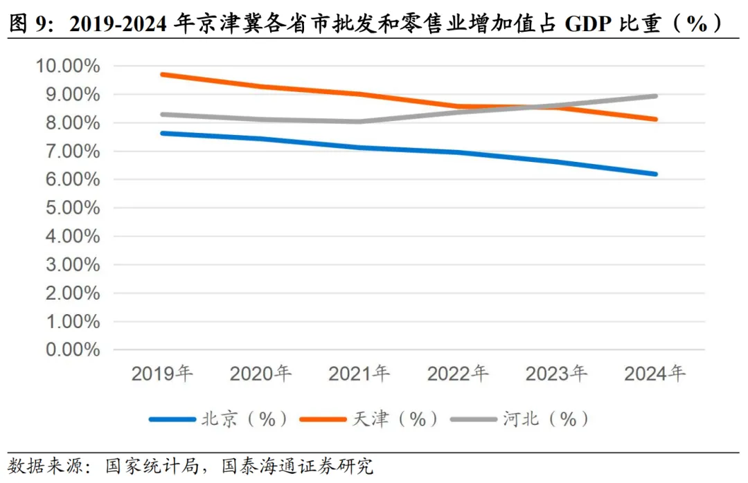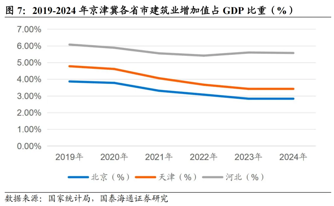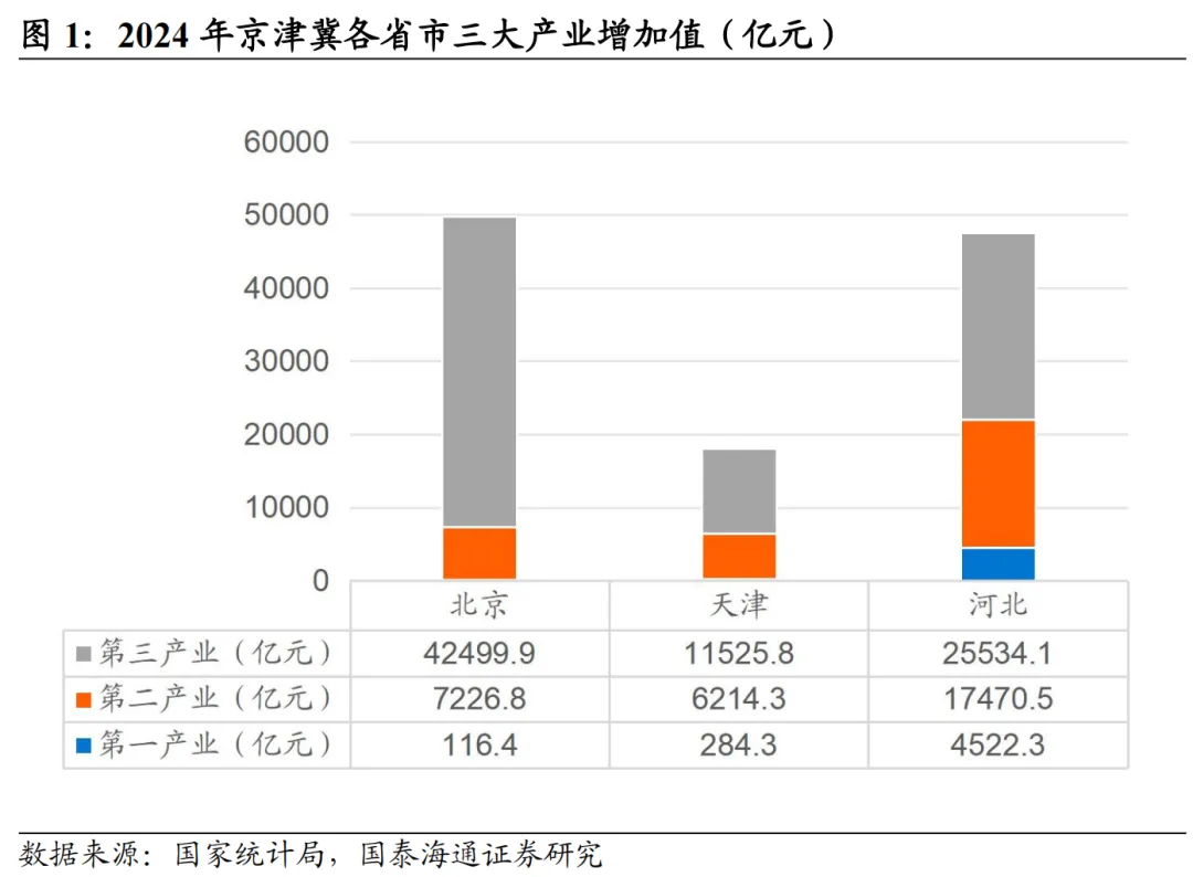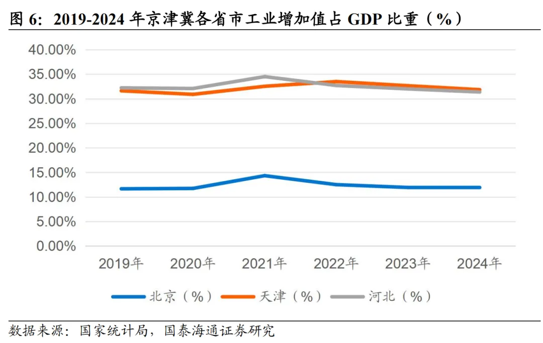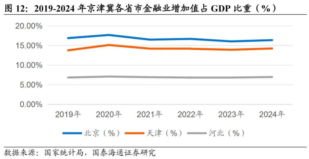 从区域分布看,京津冀区域产业结构总体呈现差异化发展路径。具体而言,一方面,北京的服务型经济地位持续巩固,三产占比由2019年的84.31%提升0.96个百分点至2024年的85.27%,一产占比则下降0.07个百分点,二产占比下降0.89个百分点,金融业、信息服务等现代服务业构成经济增长核心引擎。另一方面,天津、河北继续推进传统工业转型与农业现代化发展。其中,河北作为传统工业大省,二产占比由2019年的38.18%下降1.42个百分点至2024年的36.76%,三产占比则由2019年的51.94%提升1.78个百分点至2024年的53.73%,产业结构向“三二一”型加速转变;天津二产占比由2019年的35.59%下降1.11个百分点至2024年的34.48%。