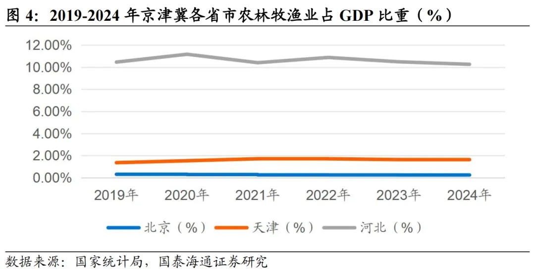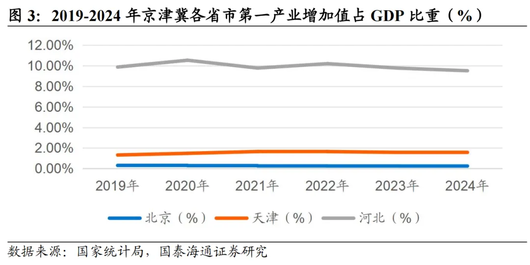 第一产业占比均在10%以下且总体呈缓慢下降态势,产业结构升级态势明确,但省市间差异明显。河北的一产对全省经济起到一定支撑作用,仍为区域农业核心承载地,2024年达9.52%,但较2019年下降0.36个百分点;北京的一产占比较低,2019-2024年保持在0.5%以下,2024年仅为0.23%,较2019年下降0.07个百分点。
