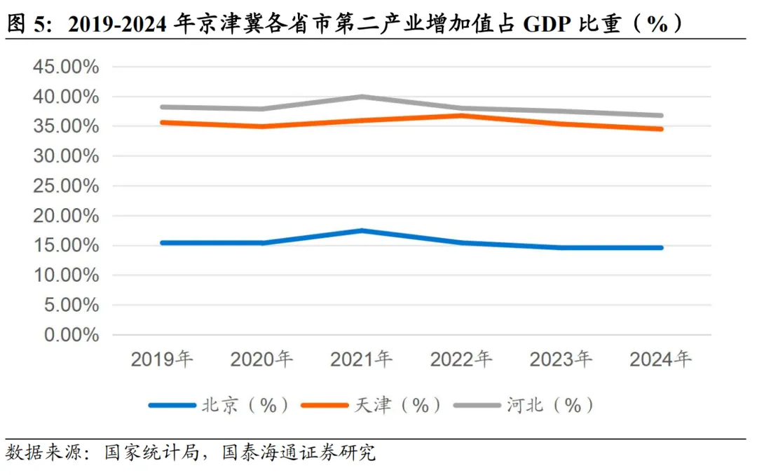 第二产业占比均在40%以下且总体呈缓慢下降态势,省市间差异同样明显。河北、天津的二产占比较高,为区域工业核心,2019-2024年保持在30%以上,2024年分别达36.76%、34.48%,但较2019年分别下降1.42和1.11个百分点;北京的二产占比较低,2019-2024年保持在20%以下,2024年为14.50%,较2019年下降0.89个百分点。