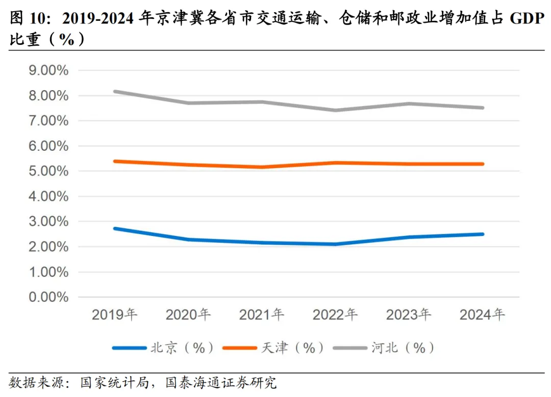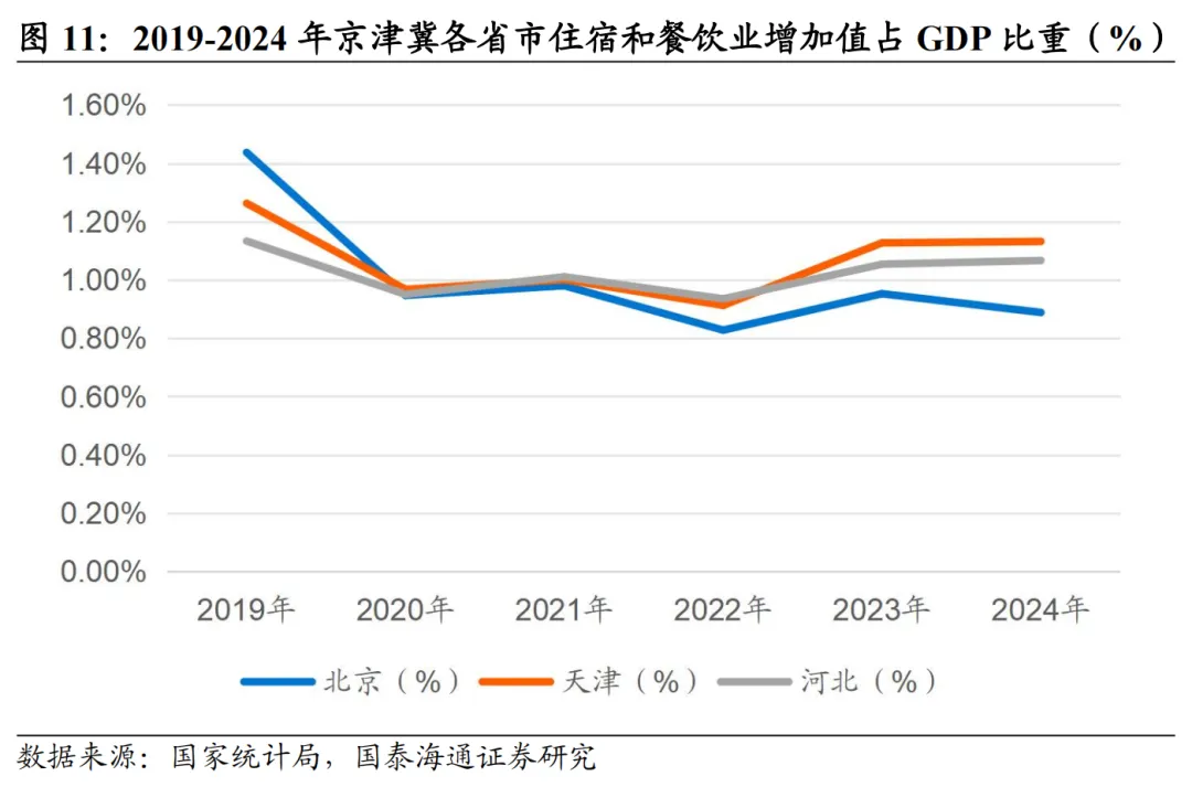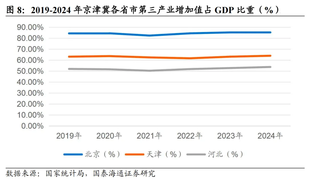 第三产业目前已成为各省市主导产业,占比均在50%以上且总体呈缓慢上升态势。北京的三产占比较高,2019-2024年保持在80%以上,2024年达85.27%,较2019年增长0.96个百分点,且区域金融功能突出;河北的三产占比相对较低,2024年为53.73%,但增幅明显,三产占比较2019年增长1.78个百分点。
