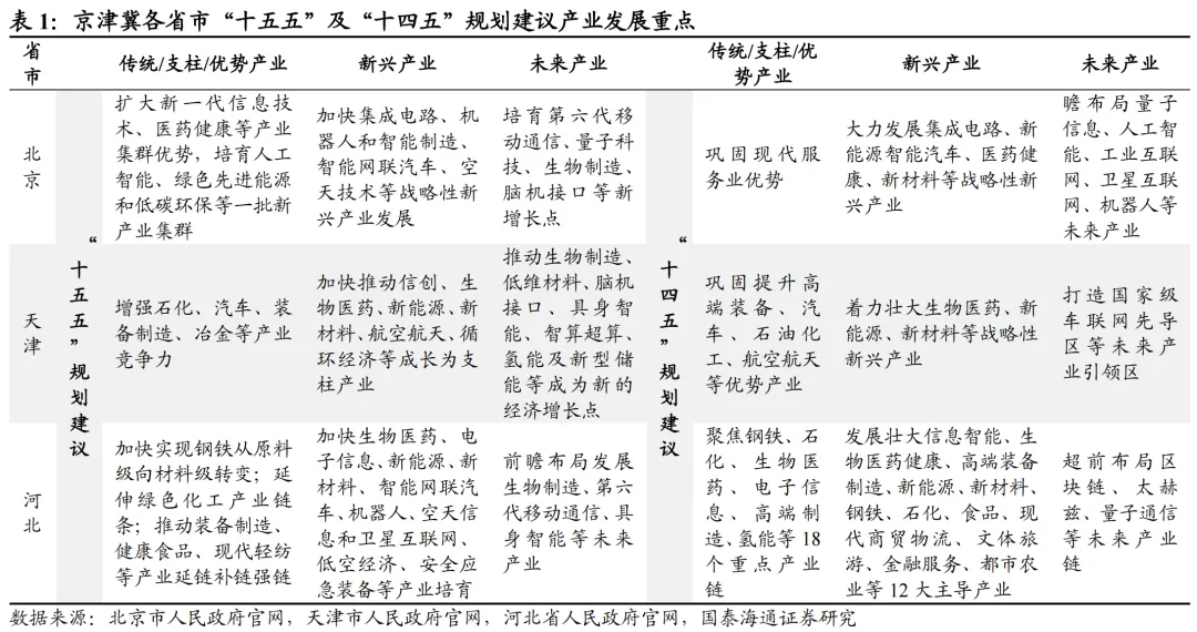 从各省市“十五五”规划建议看,相较于“十四五”规划建议,各地均将培育壮大新兴产业和未来产业置于本地现代化产业体系日益重要位置,并结合自身资源禀赋和产业基础,因地制宜明确发展重点。其中,北京“十五五”再次将集成电路列为战新产业之首,并增列机器人和智能制造、空天科技等战新产业;天津“十五五”将信创列为要发展成为的首位支柱产业,并增列航空航天、循环经济等新兴产业;河北“十五五”将生物医药提至要培育的新兴产业首位,并增列空天信息和卫星互联网、低空经济、安全应急装备等产业。