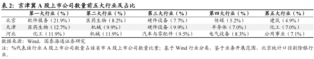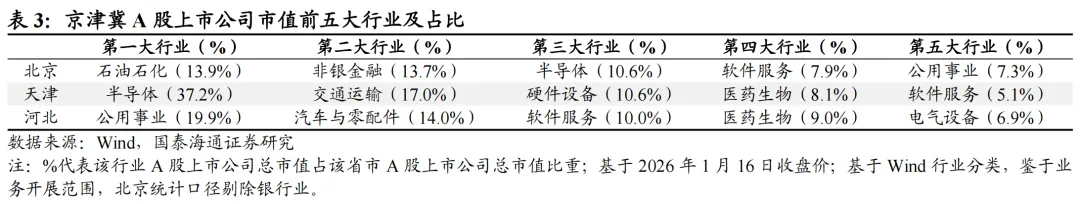 京津冀:以科技创新助力制造业数智化转型。2019-2024年,京津冀区域的产业结构呈现制造业加速数智化转型特征。第一产业占比均在10%以下且总体呈缓慢下降态势,但省市间差异明显,第二产业占比均在40%以下且总体呈缓慢下降态势,省市间差异同样明显,第三产业目前已成为各省市主导产业,占比均在50%以上且总体呈缓慢上升态势。京津冀区域产业结构总体呈现差异化发展路径。北京的服务型经济地位持续巩固,天津、河北继续推进传统工业转型与农业现代化发展。从各省市“十五五”规划建议看,相较于“十四五”规划建议,各地均将培育壮大新兴产业和未来产业置于本地现代化产业体系日益重要位置,并结合自身资源禀赋和产业基础,因地制宜明确发展重点。从各省市A股上市公司行业分布看,与各地重点发展领域基本保持一致。