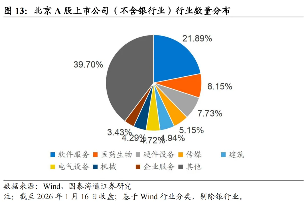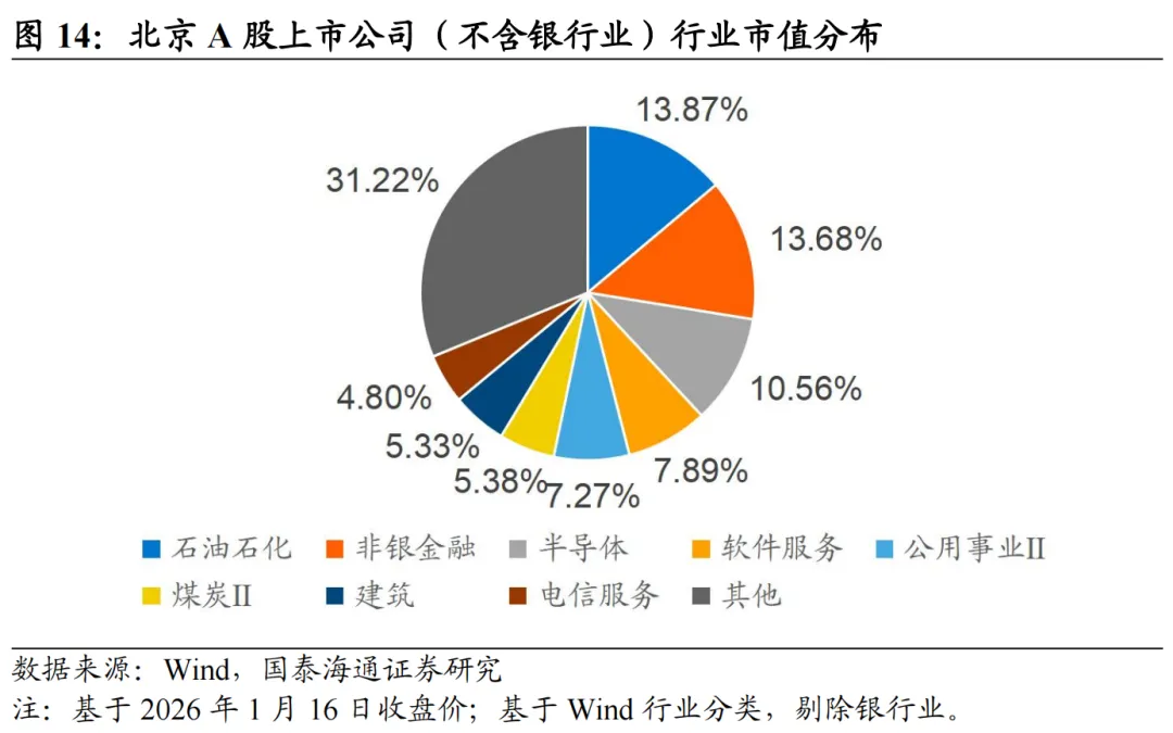 截至2026年1月16日收盘,北京A股上市公司(不含银行业)合计466家。从行业分布看,数量前五大行业依次为软件服务、医药生物、硬件设备、传媒、建筑,分别约占21.9%、8.2%、7.7%、5.2%、4.9%;基于2026年1月16日收盘价,市值前五大则依次为石油石化、非银金融、半导体、软件服务、公用事业,分别约占13.9%、13.7%、10.6%、7.9%、7.3%。