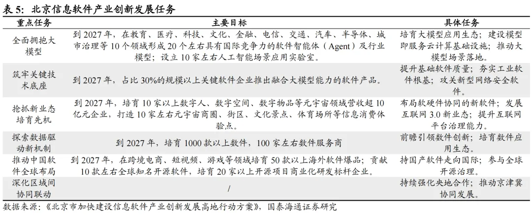 北京:以技术研发优势牵引高端产业发展。2017年12月,北京提出十个高精尖产业领域;2021年8月,进一步提出构建“2441”高精尖产业新体系。信息传输、软件和信息技术服务业已成为北京首要支柱产业。北京“十五五”规划建议将集成电路产业列为要发展的战略性新兴产业之首。2023年9月,北京进一步细化“2441”高精尖产业新体系中未来前沿产业的重点发展方向,并正加速发力未来空间产业。