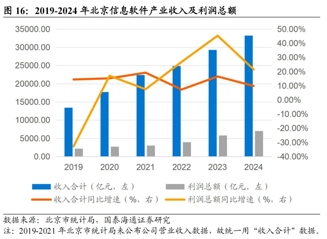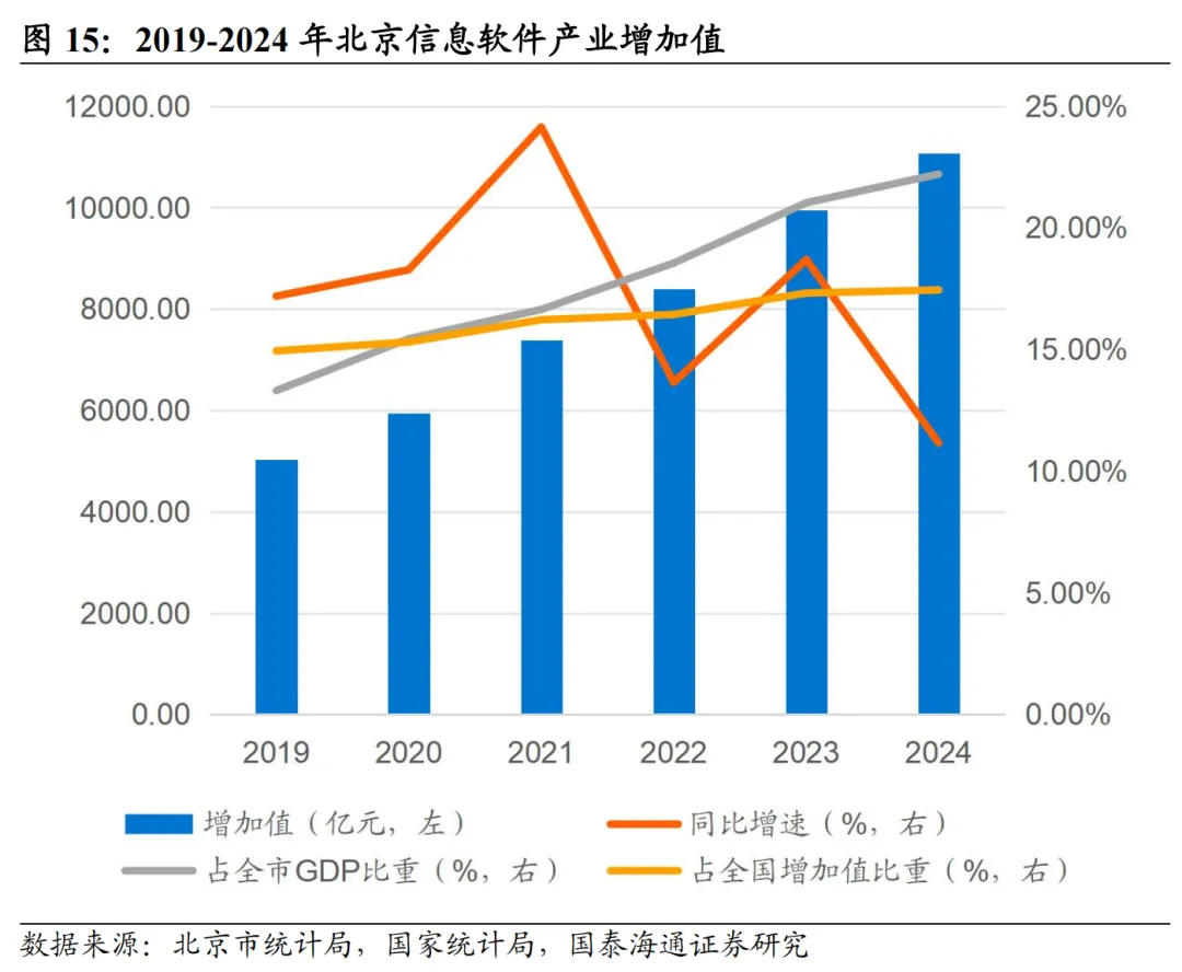 十大高精尖产业领域中,信息传输、软件和信息技术服务业(简称“信息软件产业”)已成为北京首要支柱产业。2024年4月,北京印发《北京市加快建设信息软件产业创新发展高地行动方案》,旨在培育世界一流的信息软件企业,打造具有国际竞争力的信息软件产业集群。北京“十五五”规划建议在“发展壮大高精尖产业”部分明确提出“推动重点产业提质升级,扩大新一代信息技术……等产业集群优势”。