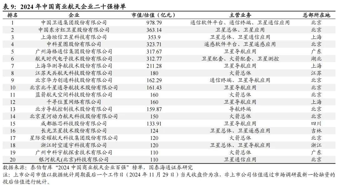 作为我国航天事业的发源地,北京正加速发力未来空间产业,已基本实现运载火箭、卫星制造、地面站及终端设备、卫星应用服务全产业链覆盖。2024年1月,北京印发《北京市加快商业航天创新发展行动方案(2024-2028年)》,计划到2028年壮大千亿级商业航天产业集群,引进和培育500家以上高新技术企业、100家以上专精特新企业和10家以上独角兽企业,上市企业数量超过20家。从规模看,据泰伯智库发布的“2024中国商业航天企业百强榜单”,估值(市值)最高的100家商业航天企业中,总部位于北京的合计45家,数量位居全国首位,远高于并列第二的上海与广东(9家)。截至2025年6月,北京商业航天产业规模已超2600亿元,高新技术企业超300家,上市企业和独角兽企业均占全国半数以上。
