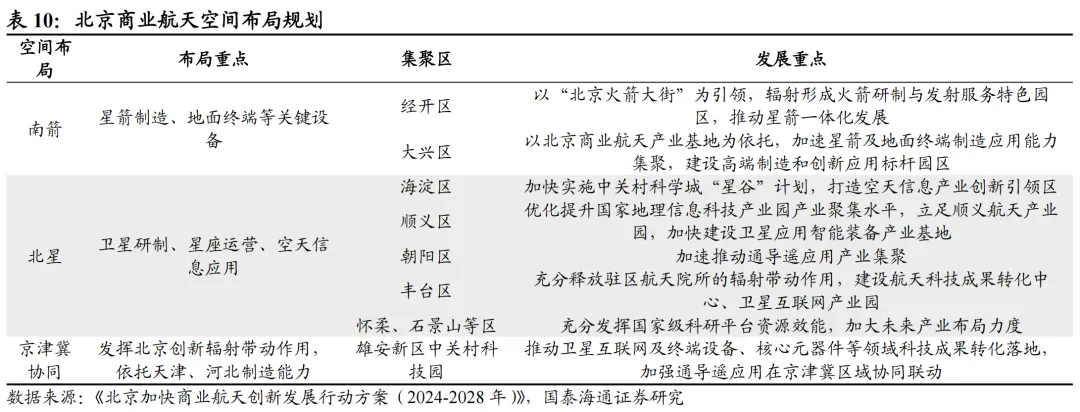 从布局看,北京初步形成“南箭北星”格局。其中,“南箭”聚焦星箭制造、地面终端等方面关键设备,在经开区、丰台区、大兴区集聚了全国70%以上的商业火箭整箭企业,基本实现火箭研制全产业链覆盖;“北星”重点聚焦卫星研制、星座运营以及空天信息应用,在海淀区集聚了一批商业卫星制造企业,基本实现卫星制造全产业链覆盖,整星研制能力全国领先。作为全国商业航天产业的核心承载区,北京经开区2024年2月启动“参天计划”并发布《北京经济技术开发区关于建设具有全球影响力商业航天产业高地的若干措施》,计划到2028年形成500亿级商业航天产业集群,引进和培育100家以上高新技术企业、50家以上专精特新企业和5家以上独角兽企业,上市企业数量超过5家。经开区现已集聚空天企业超160家,2024年空天产业规模突破350亿元。