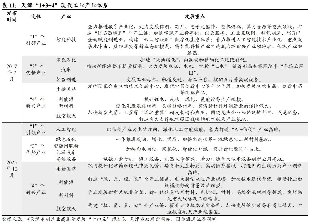 2017年2月,天津出台《天津市制造业高质量发展“十四五”规划》,提出构建“1+3+4”现代工业产业体系,并提出实施京津冀产业协同发展、产业强基、产业链再造、产业集群培育、优质企业锻造、重大项目牵引、绿色低碳转型、产业生态优化等八大工程。2025年12月,天津进一步提出打造“1+3+4”现代工业产业体系升级版。