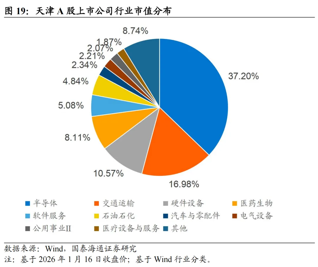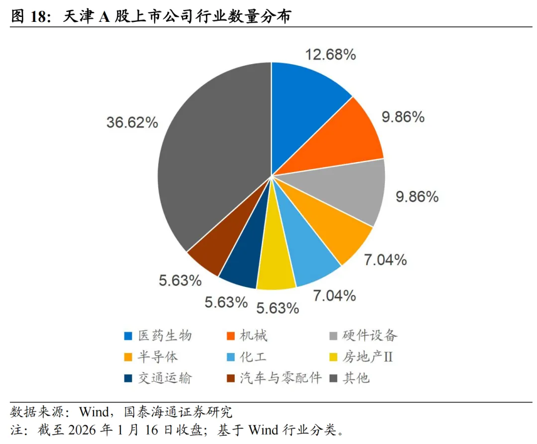 截至2026年1月16日收盘,天津A股上市公司合计71家。从行业分布看,数量前五大行业依次为医药生物、机械、硬件设备、半导体、化工,分别约占12.7%、9.9%、9.9%、7.0%、7.0%;基于2026年1月16日收盘价,市值前五大则依次为半导体、交通运输、硬件设备、医药生物、软件服务,分别约占37.2%、17.0%、10.6%、8.1%、5.1%。