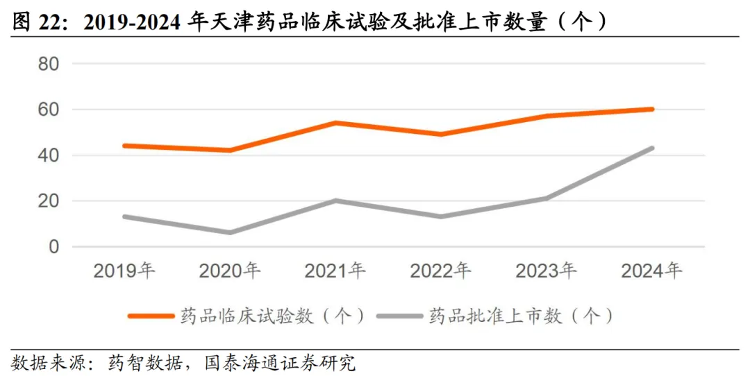 从产品看,2025年1-11月,天津医疗仪器设备及器械产量达792.29万台,同比增长77.9%。2024年,天津的药品临床试验数(以品种计)为60个,同比增长5.3%,批准上市数(以品种计)为43个,同比增长104.8%。
