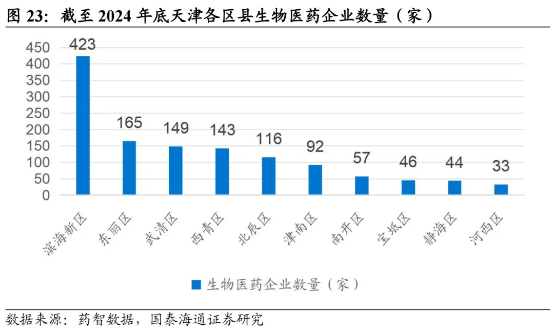 其中,滨海高新区“十四五”时期将生物医药产业作为核心主导产业,产值年均增长率达16%,截至2025年底,共有生物医药领域国家级创新平台近20个,集聚细胞及基因治疗产业链上下游企业100余家,基本覆盖“细胞提取制备-细胞存储-冷链物流-创新研发-小试中试-审评审批-临床应用”全产业链。2025年上半年,滨海新区生物医药产业产值达319.36亿元,同比增长13.4%,高于同期GDP增速8个百分点,并基本形成覆盖化学药、生物制造、医疗器械的全产业链布局。截至2024年,滨海新区拥有生物医药企业423家,数量位列全市第一,占比约为30.0%。