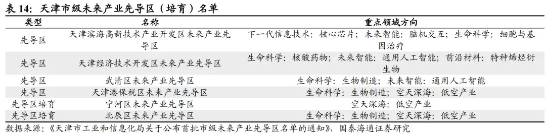 天津:以应用场景示范赋能产业链落地。2017年2月,天津提出“1+3+4”现代工业产业体系,并于2025年12月提出“1+3+4”现代工业产业体系升级版。近年来,天津将信息技术应用创新产业作为首位度产业,将生物医药产业列为“1+3+4”现代工业产业体系中4个新兴产业中之首,并在生物制造和合成生物领域布局较早。