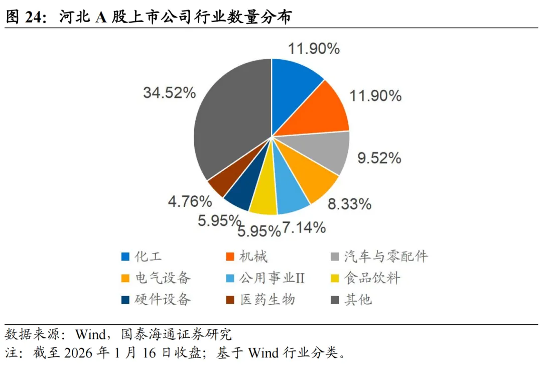 截至2026年1月16日收盘,河北A股上市公司合计84家。从行业分布看,数量前五大行业依次为化工、机械、汽车与零配件、电气设备、公用事业,分别约占11.9%、11.9%、9.5%、8.3%、7.1%;基于2026年1月16日收盘价,市值前五大则依次为公用事业、汽车与零配件、软件服务、医药生物、电气设备,分别约占19.9%、14.0%、10.0%、9.0%、6.9%。