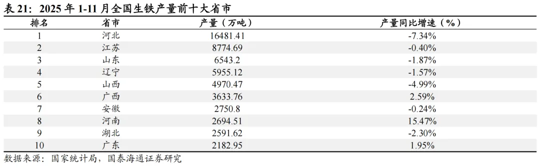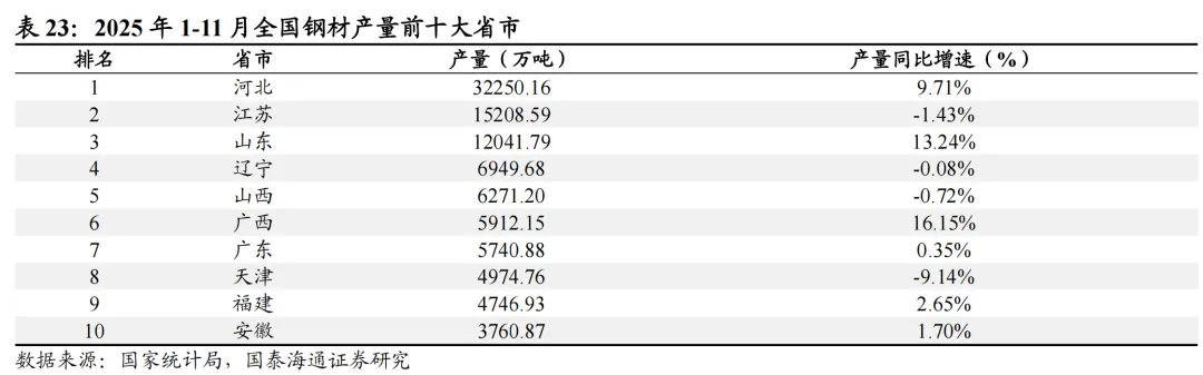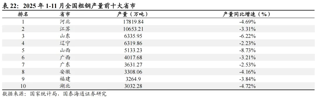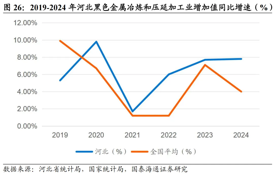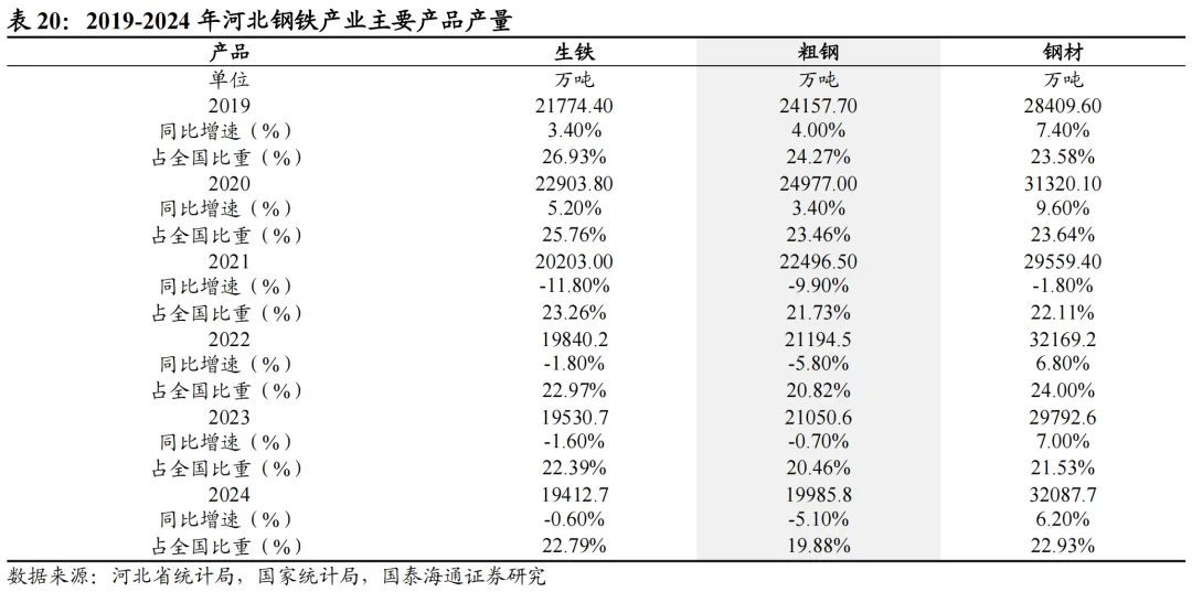 从产品看,2025年1-11月河北生铁、粗钢、钢材累计产量分别达1.65亿吨、1.78亿吨、3.23亿吨,均位列全国首位。2024年,河北生铁、粗钢、钢材产量分别达1.94亿吨、2.00亿吨、3.21亿吨,占全国比重分别达22.8%、19.9%、22.9%,2019-2023年占比维持在20%以上。