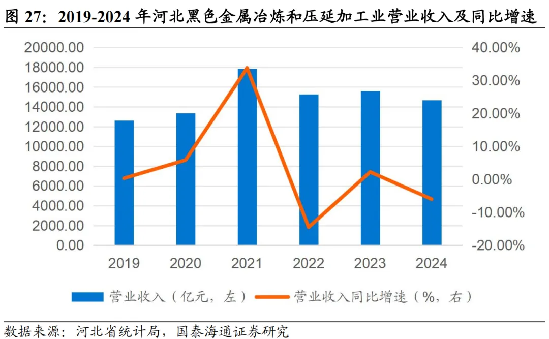 从规模看,2024年,河北黑色金属冶炼和压延加工业增加值同比增长7.8%,高于GDP增速2.4个百分点,高于全国平均水平3.8个百分点;营业收入达1.47万亿元,占全国比重达18.0%;利润总额达49.4亿元,同比增长23.5%,占全国比重达16.9%。
