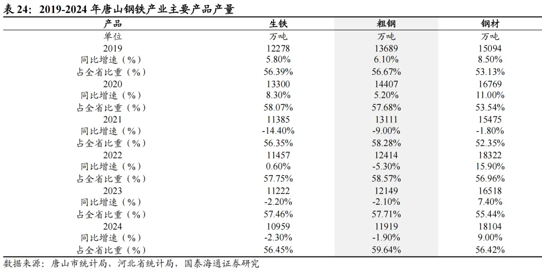 从布局看,河北钢铁产业充分发挥沿海临港和铁路沿线的运力资源优势,以唐山、邯郸等区域为重要承载地。特别是唐山,作为一座具有百年历史的沿海工业城市,钢铁产业是当地最具代表性的产业之一,主副行业门类齐全、产业链完整。2024年,唐山生铁、粗钢、钢材产量分别达1.10亿吨、1.19亿吨、1.81亿吨,占河北比重分别达56.5%、59.6%、56.4%,且2019-2024年占比均维持在50%以上。与此同时,唐山持续推动产业绿色化转型升级,现已培育出国家级绿色工厂19家、省级绿色工厂26家,2024年完成26家在产钢铁企业全面创A,数量位列全国第一。