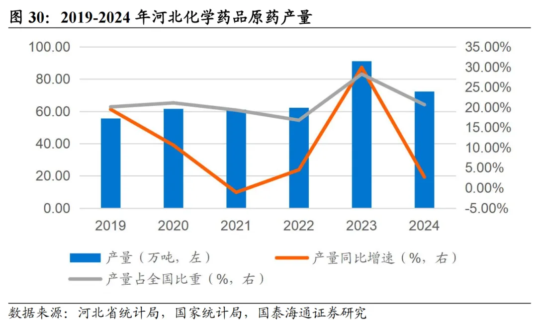从产品看,2024年河北化学药品原药产量达72.4万吨,同比增长2.7%,占全国比重达20.7%。