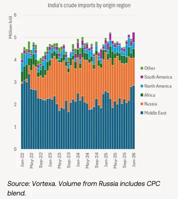 自去年10月以来,印度已成为中东和大西洋地区合规石油的关键增长市场。受制裁影响,印度进口俄罗斯原油下降的缺口几乎由中东和南美均分:2025年第三季度至 2026年1月,俄罗斯(含里海管道联盟(CPC)混合原油)在印度进口中的占比下降近13%,中东占比提升7.2%(主要来自沙特阿拉伯、卡塔尔和伊拉克),拉丁美洲占比提升6.6%(主要来自巴西,抵消了去年10月关税调整后美国出口量的下滑)。