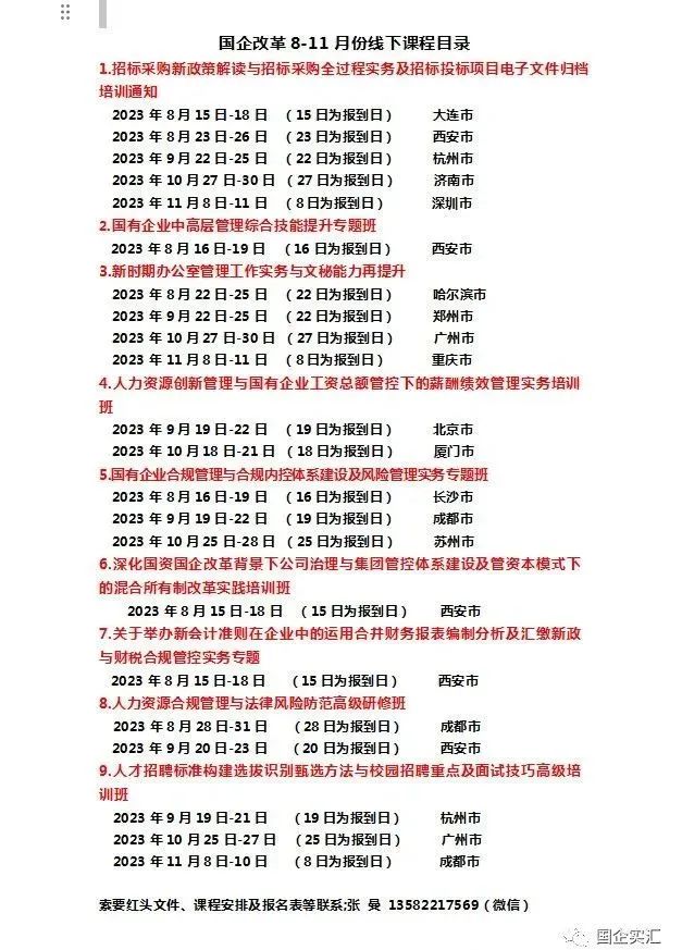 为全面深化大风控、大监督体系建设,建立健全以风险管理为导向、以合规管理监督为重点的内控体系,完善以管资本为主的国有资产监管体制,切实做到依法合规经营,扎实推动国有企业各项工作再上新台阶,中国投资协会培训中心与北京中会联信息咨询中心定于9月在成都市举办“国有企业合规管理与全流程风险管控实务”培训班,培训班由北京中会联信息咨询中心承办。现将有关事项通知如下: