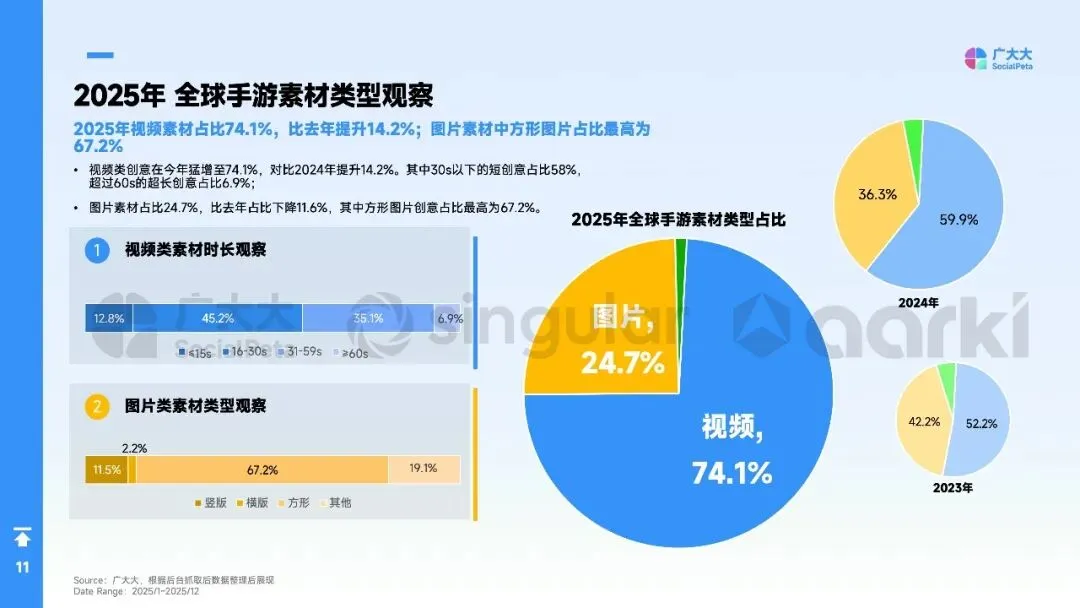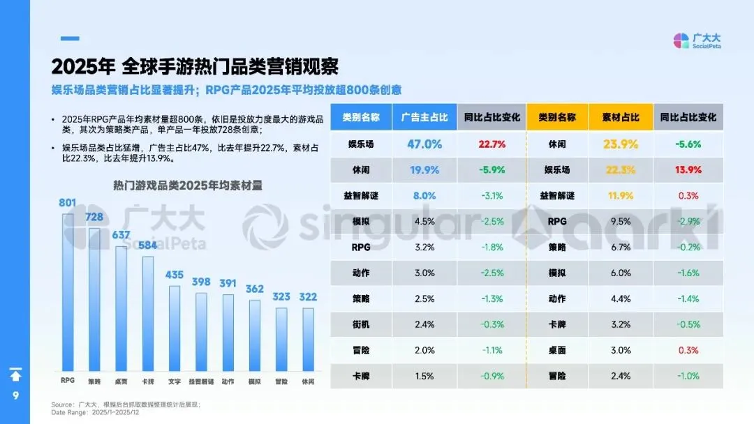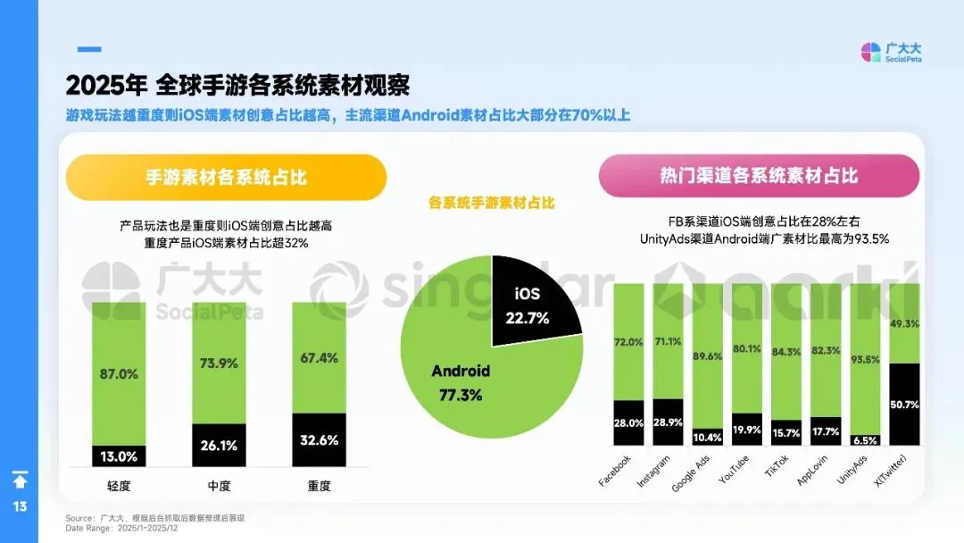 全球手游市场已从“流量狂飙”转向“效率与信任”的深度耐力赛,精细化运营与AI赋能成为破局关键。2025年全球手游月均广告主同比增长21.9%,但用户获取成本上升12%、预算增长26%却仅换来用户规模2%的微增。与此同时,视频素材占比跃升至74.1%,娱乐场品类广告主占比猛增22.7%,而超过95%的玩家会在30天内流失。