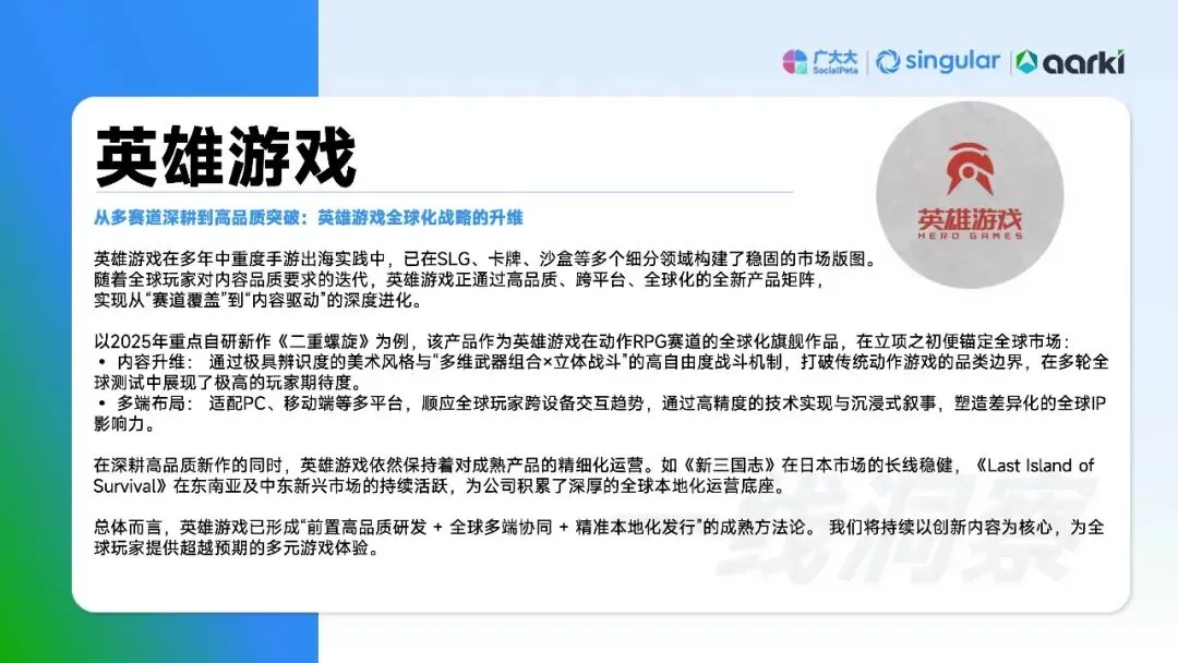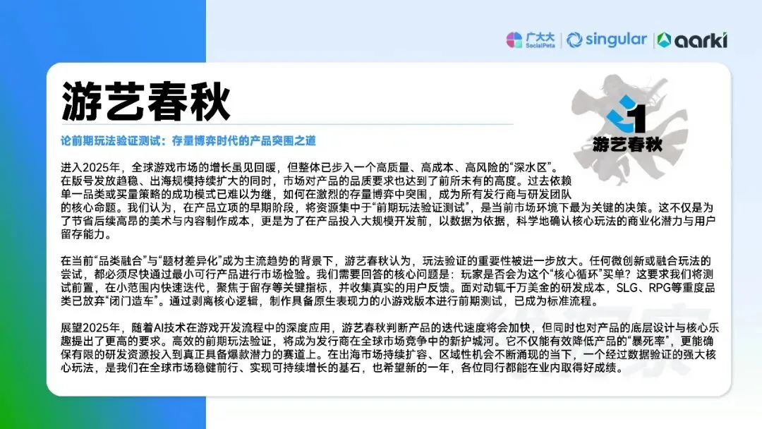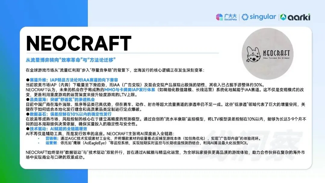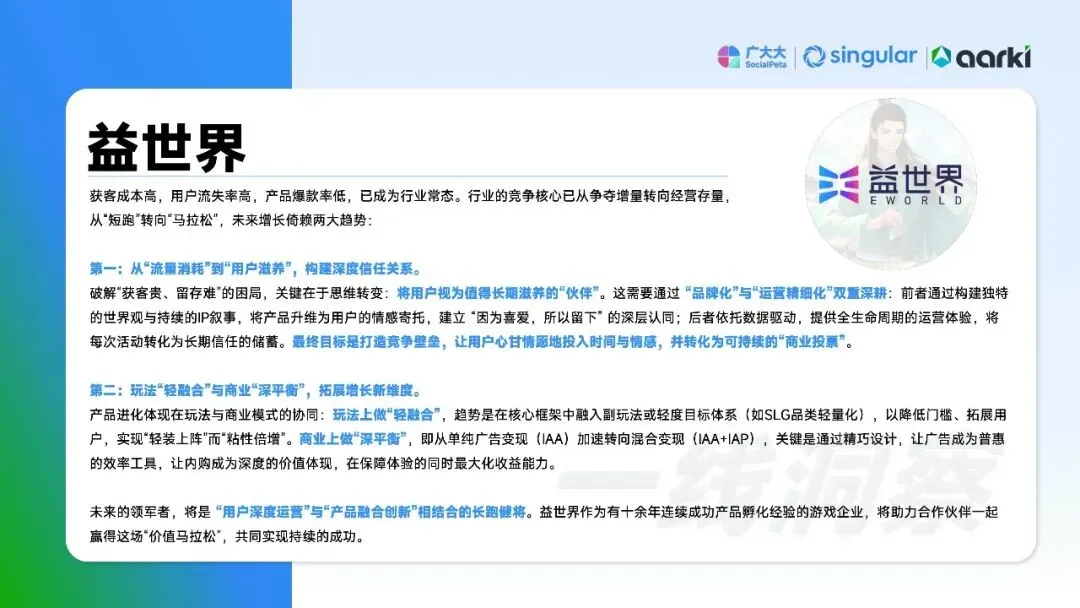 数据揭示市场已进入存量博弈的“深水区”。粗暴买量模式触及天花板,竞争核心从争夺增量转向经营存量。领先厂商正通过“人机共智”实现系统性破局:一方面,利用AI驱动素材工业化生产(如AIGC素材占比提升)并优化全链路投放效率;另一方面,将运营重心从“获客”转向“留客”,构建以用户留存和生命周期价值(LTV)为核心的增长循环,从“流量消耗者”转型为“用户滋养者”。