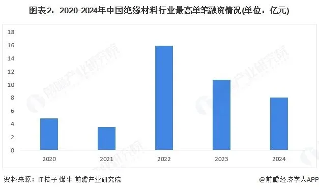 从已公布的单笔融资金额来看,2020-2024年,国内绝缘材料行业最高单笔融资金额发生在2022年,达15.95亿元。