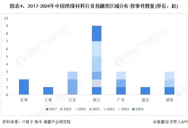 从绝缘材料行业的企业融资区域来看,近年来全国绝缘材料行业投融资事件集中在浙江、广东、江苏和湖南等省市,其中浙江的融资企业最多,2017-2024年累计达到9起。