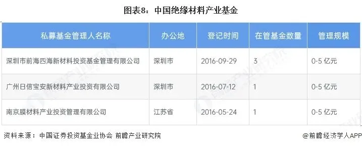 绝缘材料行业的产业投资基金比较少,目前在中国证券投资基金业协会中仅查询到相关产业基金三家,其中深圳市前海四海新材料投资基金管理有限公司管理数量较多,在管基金共3只。