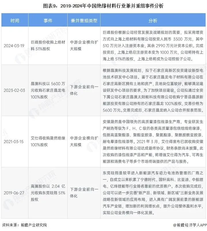 近年来,中国绝缘材料行业发生的兼并重组事件较少,兼并重组的类型主要为中游企业横向收购扩大规模。