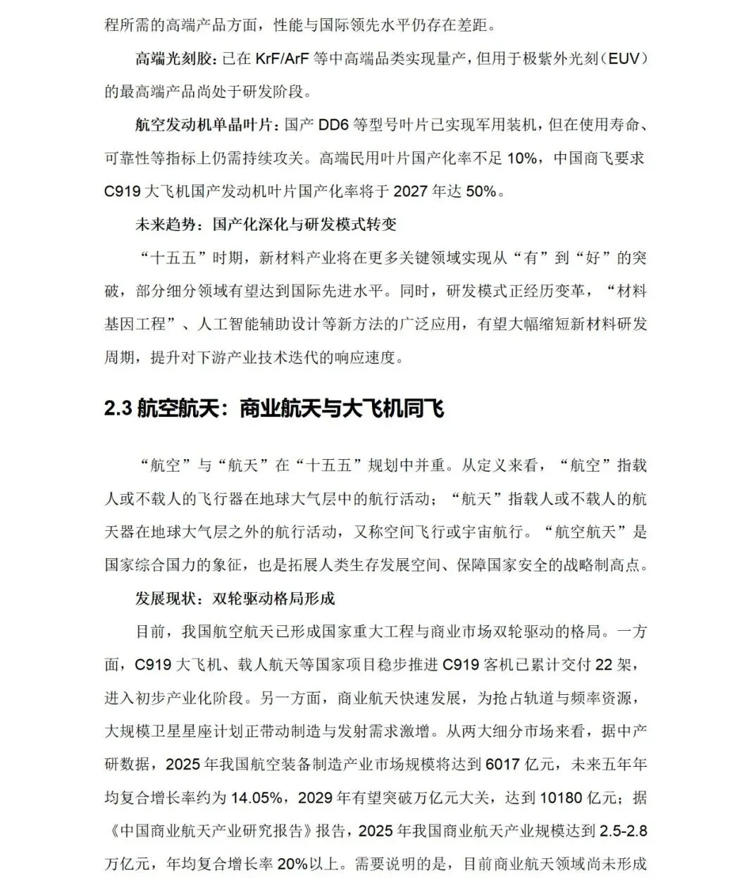 现状:形成国家重大工程(如C919、载人航天)与商业航天双轮驱动格局。