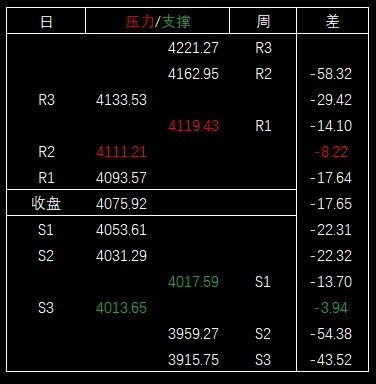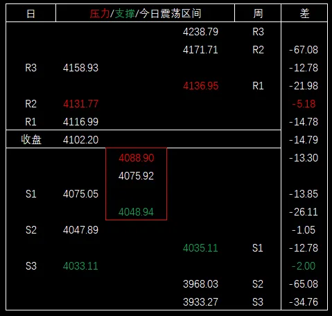 今天大盘最高4088.90,未触及压力区间,比昨日收盘4102.20低13.30,比日第一支撑位4075.05高13.85。