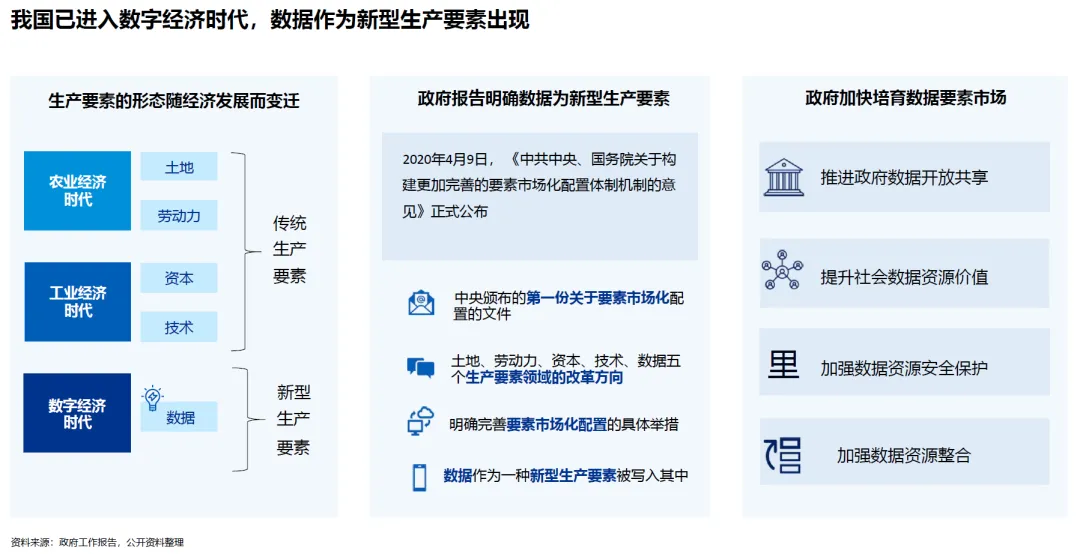 随着经济社会的持续发展,生产要素形态不断演进。农业经济时代以土地为核心生产要素,工业经济时代聚焦劳动力、资本与技术,而步入数字经济时代,数据已成为被政府明确认可的新型生产要素。2020 年 4 月 9 日,《中共中央、国务院关于构建更加完善的要素市场化配置体制机制的意见》正式公布,这是中央颁布的第一份关于要素市场化配置的文件,明确将土地、劳动力、资本、技术、数据列为五大生产要素,并规划了各领域的改革方向与具体举措,标志着我国数据要素市场培育进入加速阶段。政府层面正通过推进数据开放共享、提升社会数据资源价值、加强数据安全保护与资源整合等一系列举措,为数据要素的合理配置与高效利用奠定基础。