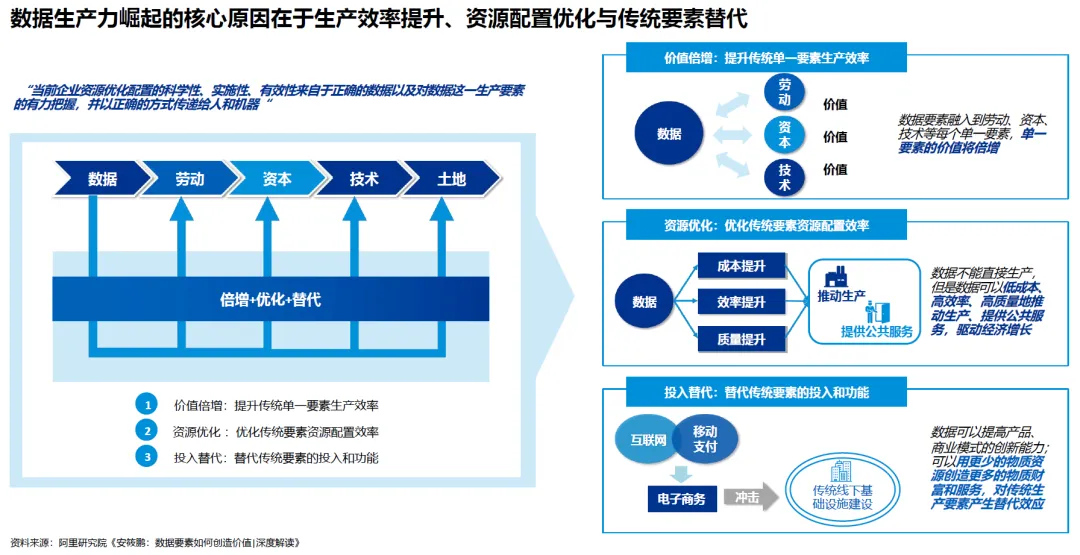 数据生产力的崛起并非偶然,其核心驱动力在于数据能通过价值倍增、资源优化与投入替代三条路径,重塑传统生产模式并创造新增价值。